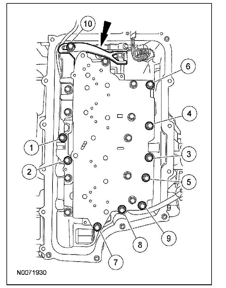 5. Install the TR sensor detent spring and the 10 bolts. Tighten the bolts in the sequence shown.