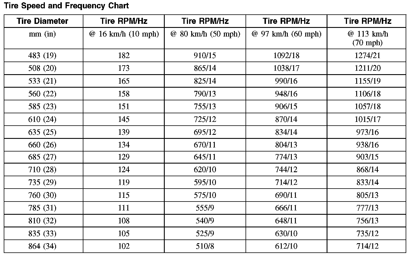 - Obtain the corresponding tire and wheel rpm and frequency from the Tire Speed and Frequency Chart.