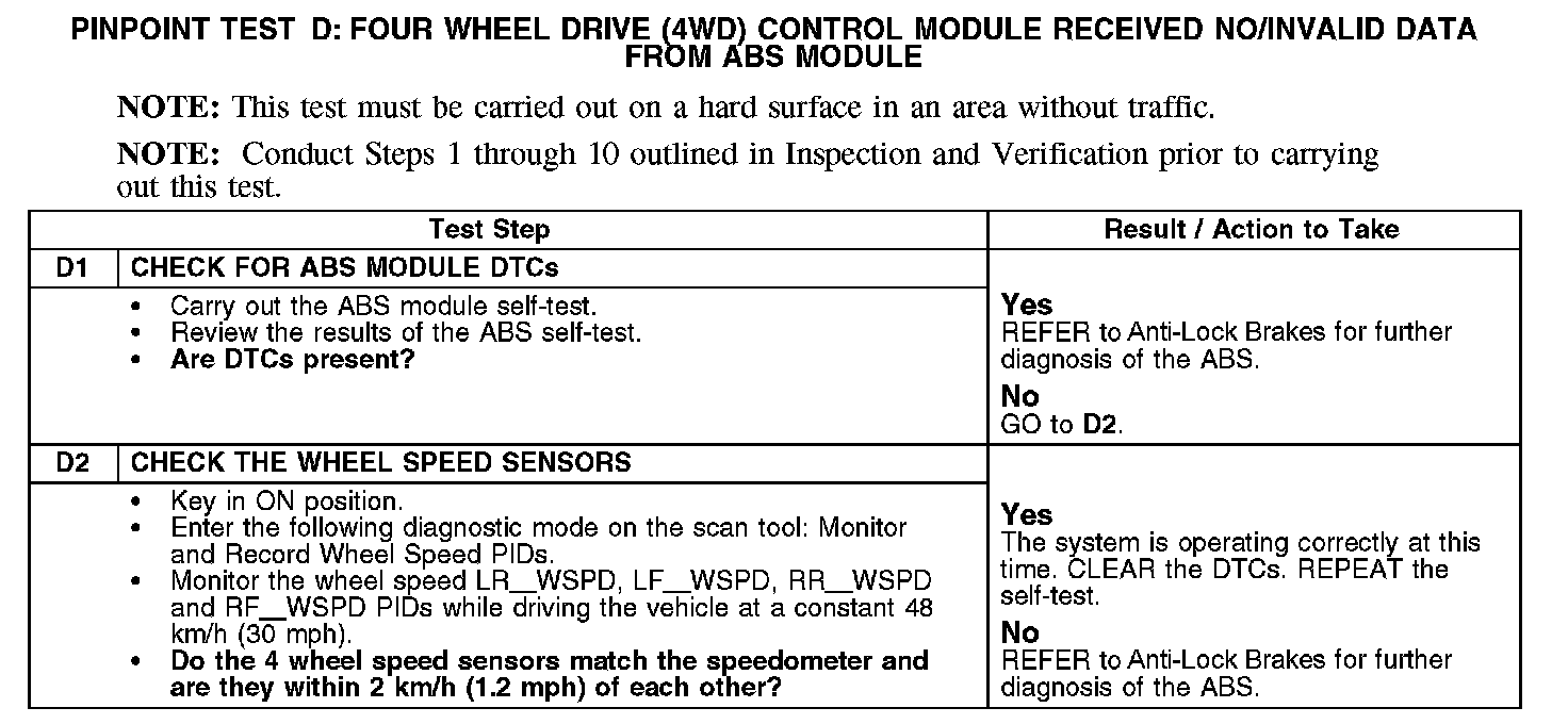 Pinpoint Test D: Four Wheel Drive (4WD) Control Module Received No/Invalid Data From ABS ModuleRefer to Vehicle/Diagrams, Four Wheel Drive (4WD) Systems for schematic and connector information.