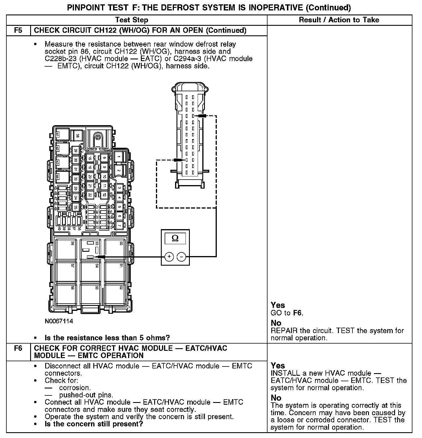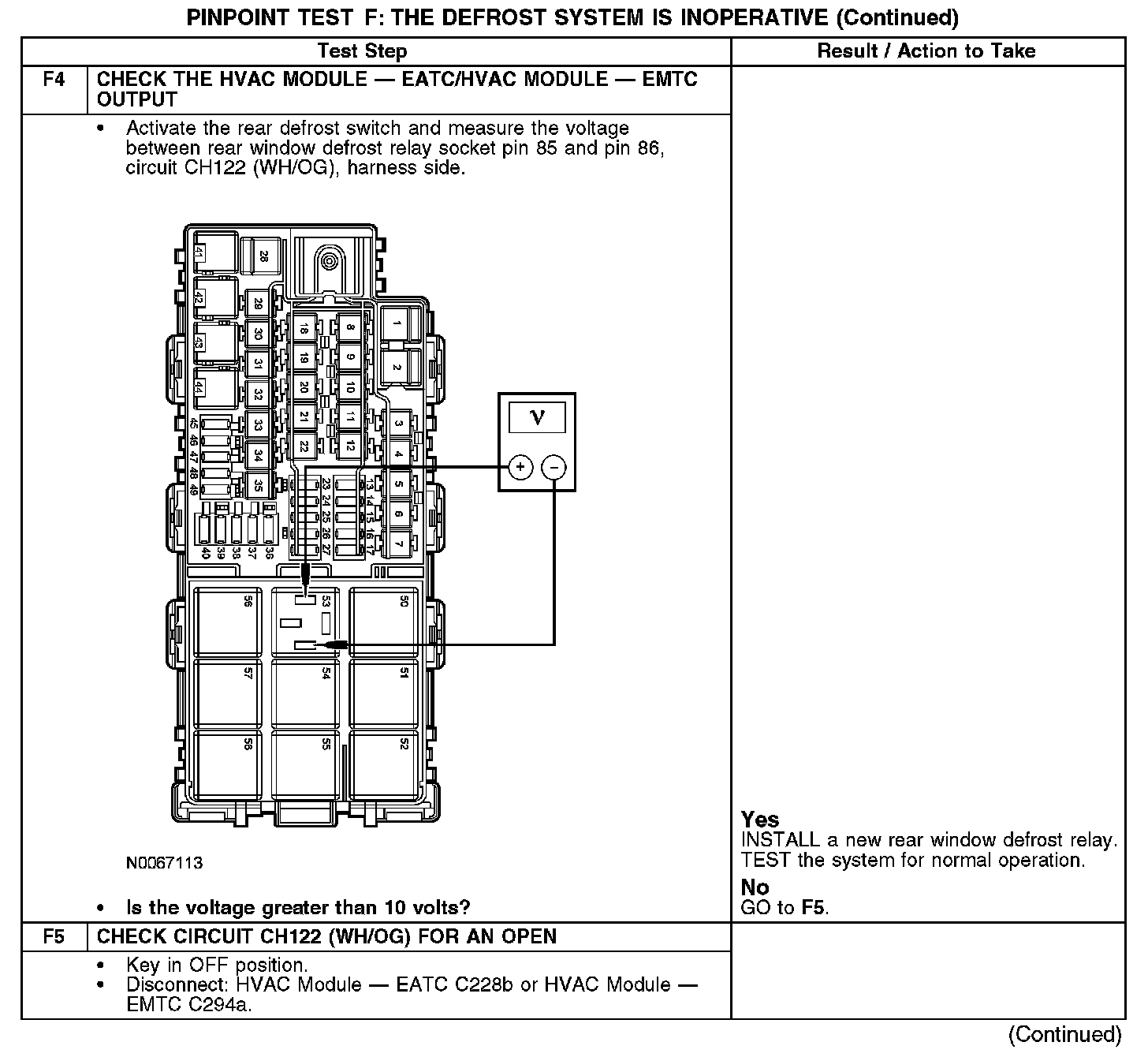 During normal operation, the heating ventilation air conditioning (HVAC) module - electronic automatic temperature control (EATC) module or HVAC module - electronic manual temperature control (EMTC) activates the rear window defrost relay by grounding the relay coil through circuit CH122 (WH/OG). When the defrost relay is activated, power is supplied from the relay to the rear window defrost grid through circuit CRD06 (BN/YE). Ground is supplied to the rear window defrost grid through circuit GD147 (BK/VT).