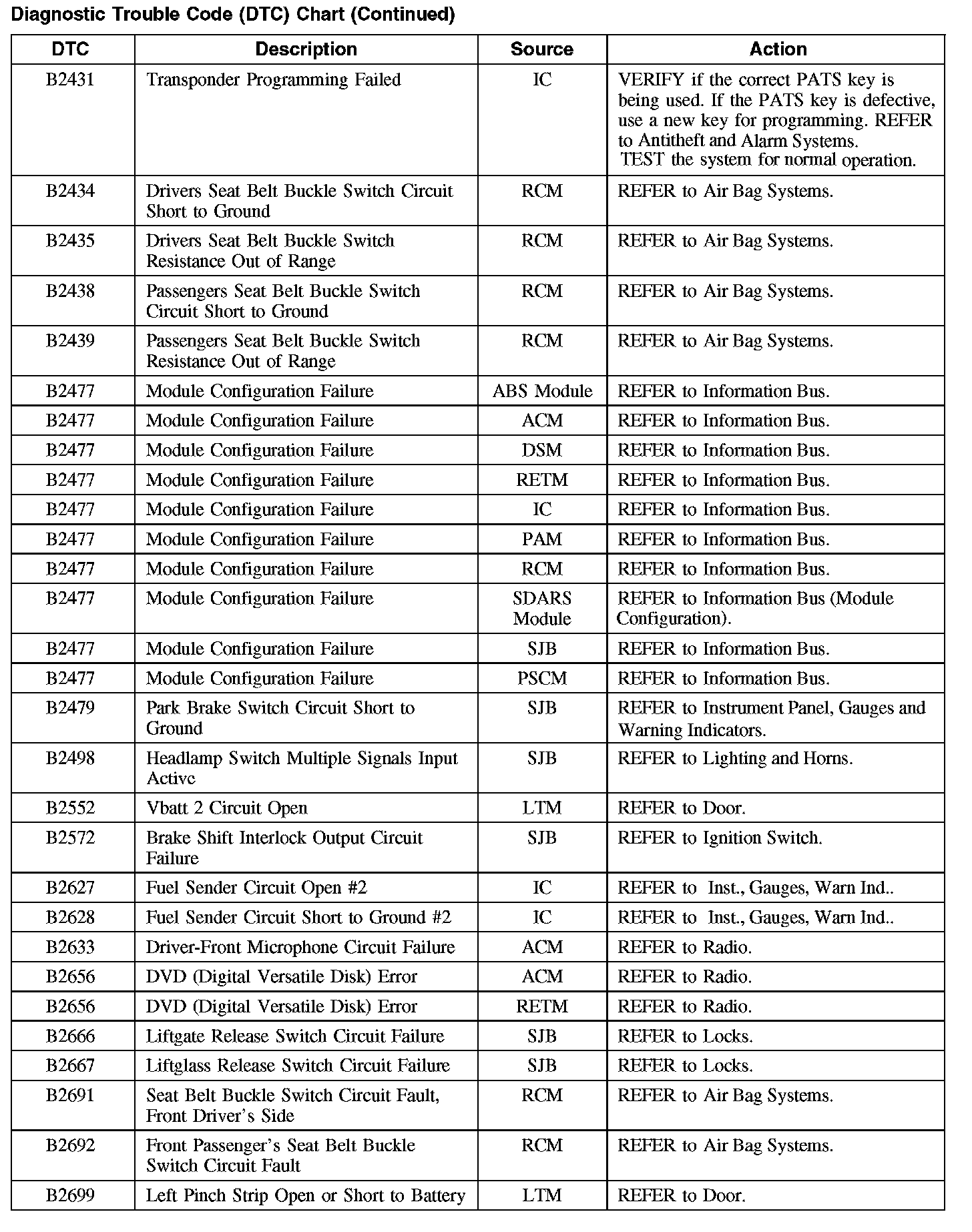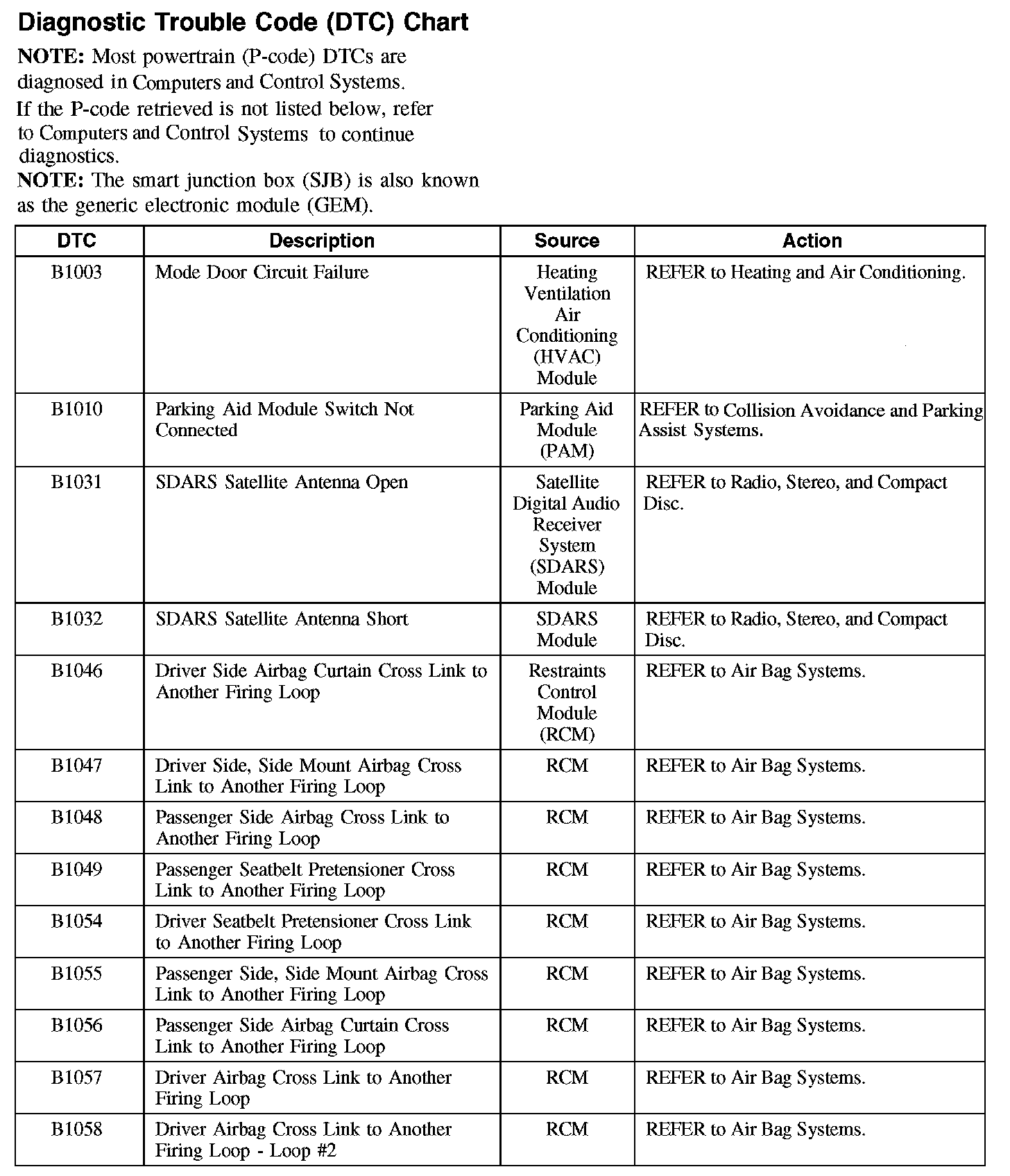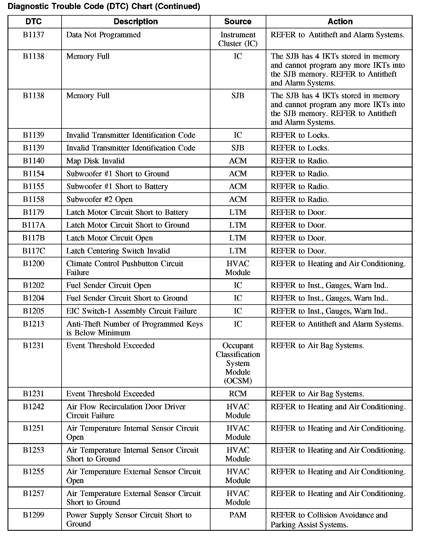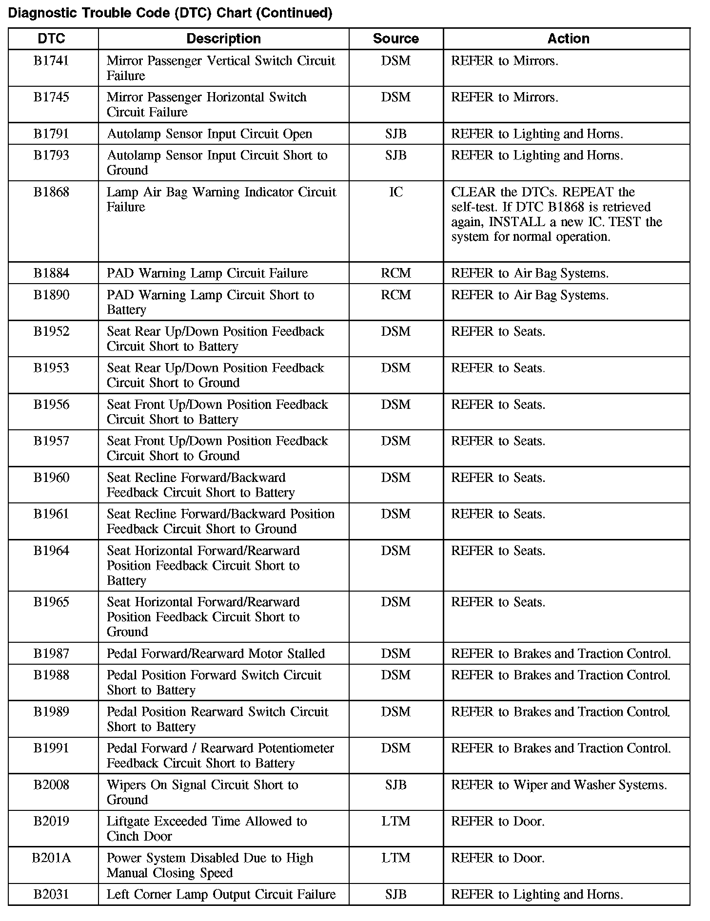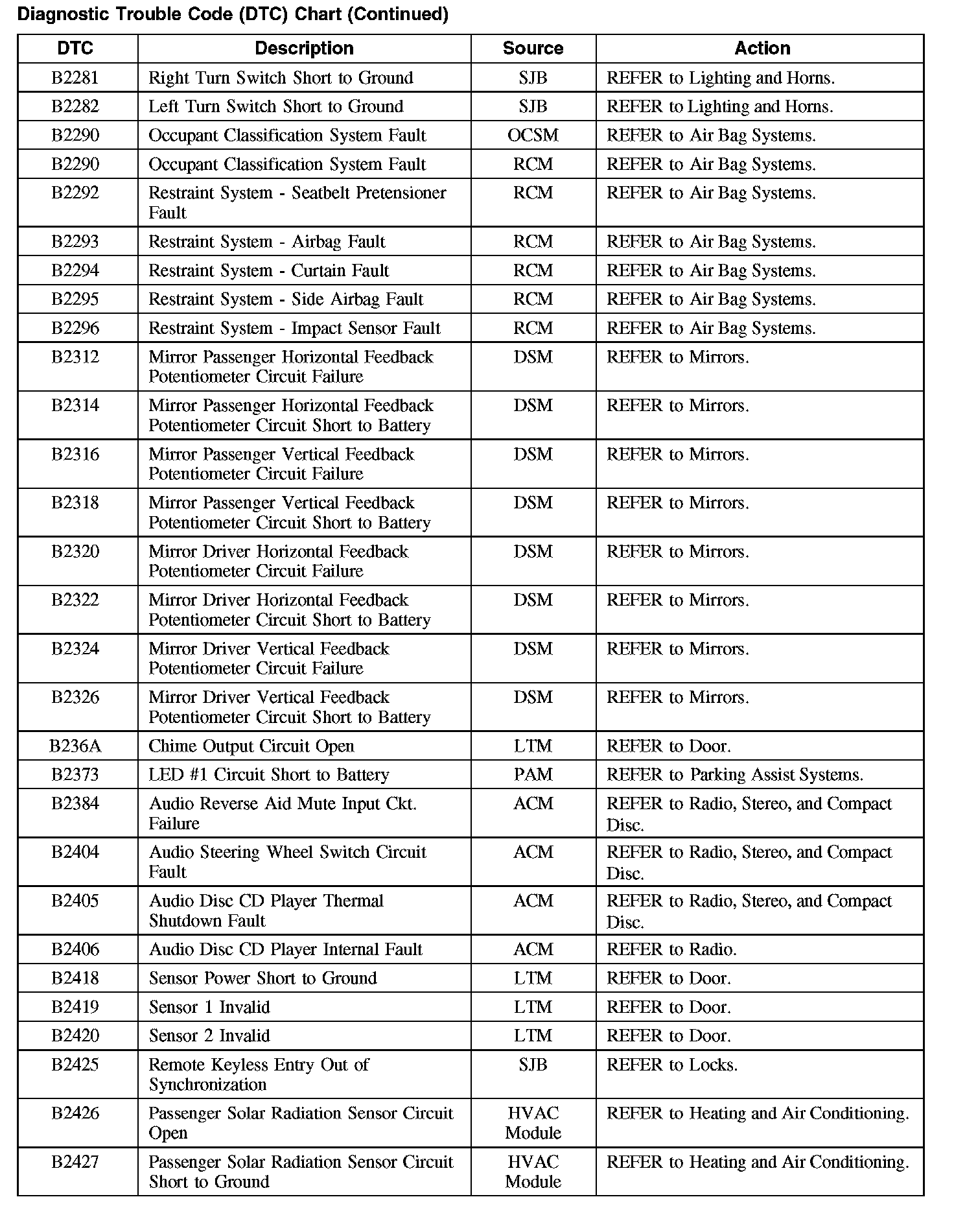 Home >> Ford >> 2008 >> Taurus FWD V6-3.5L >> Repair and Diagnosis >> Body and Frame >> Body Control Systems >> Testing and Inspection >> Diagnostic Trouble Code Descriptions >> Diagnostic Trouble Code (DTC) Chart