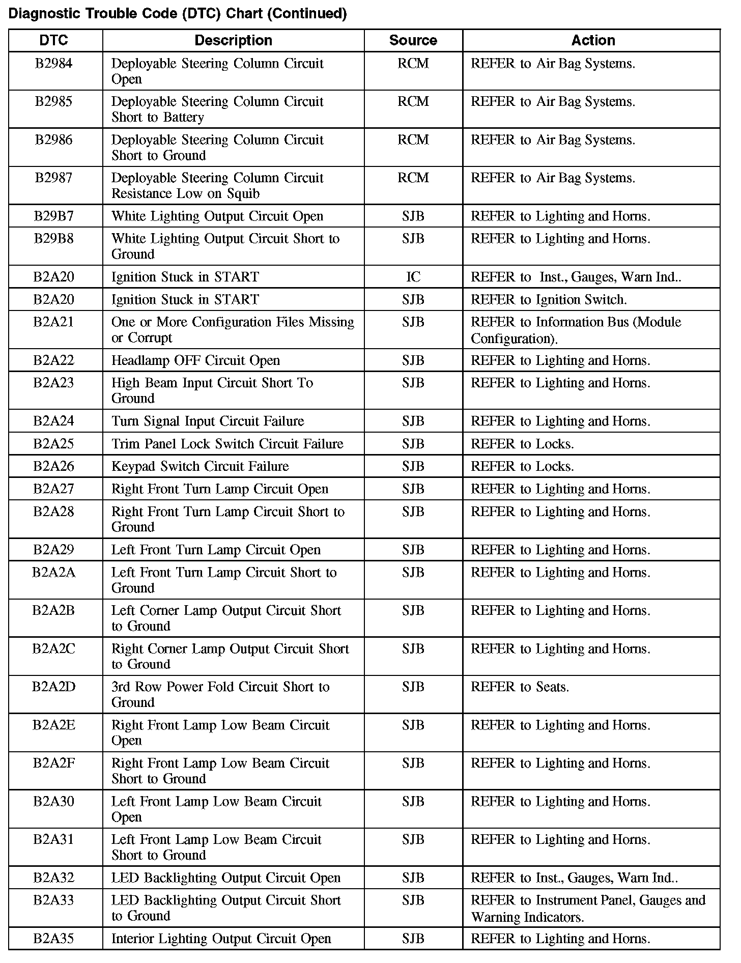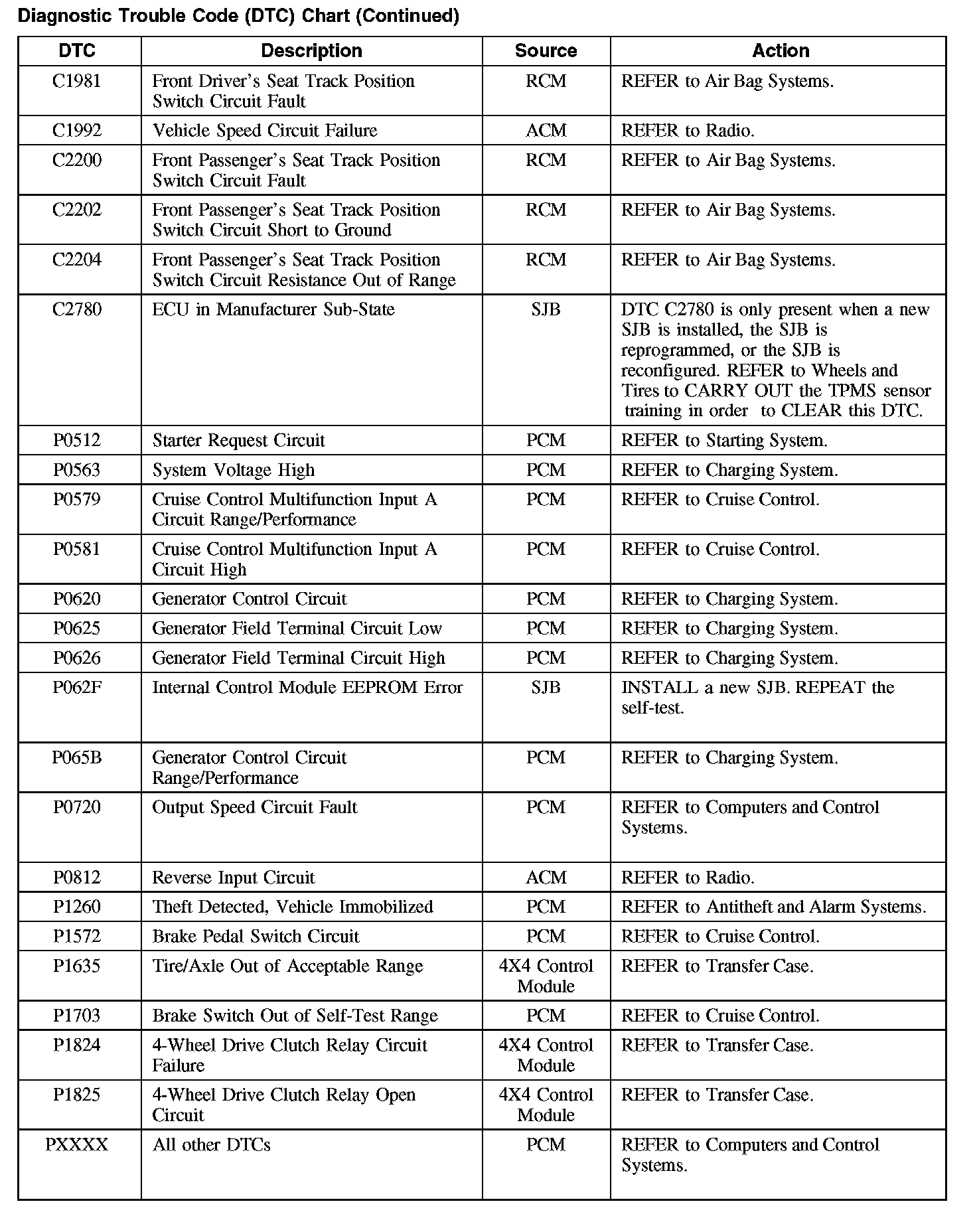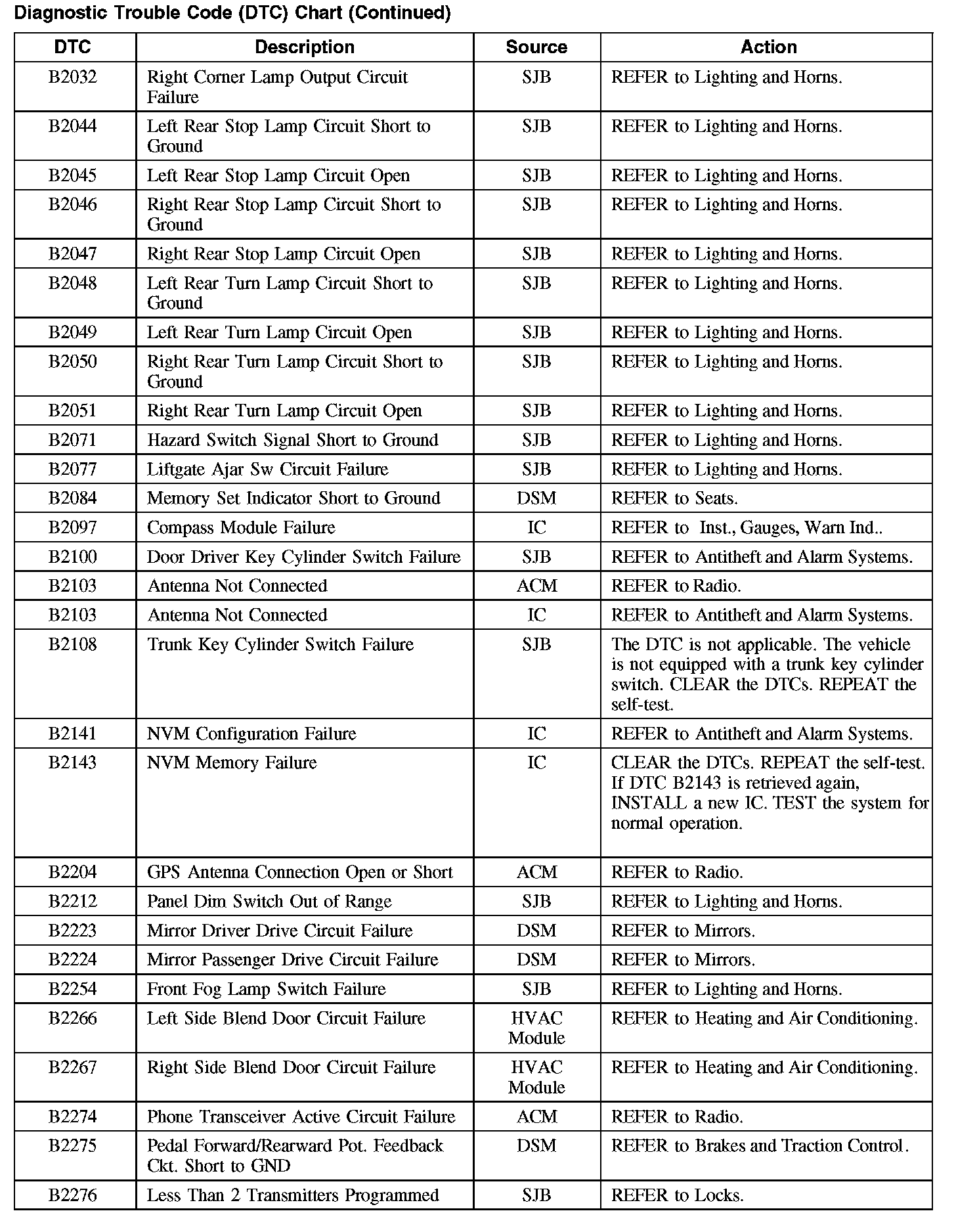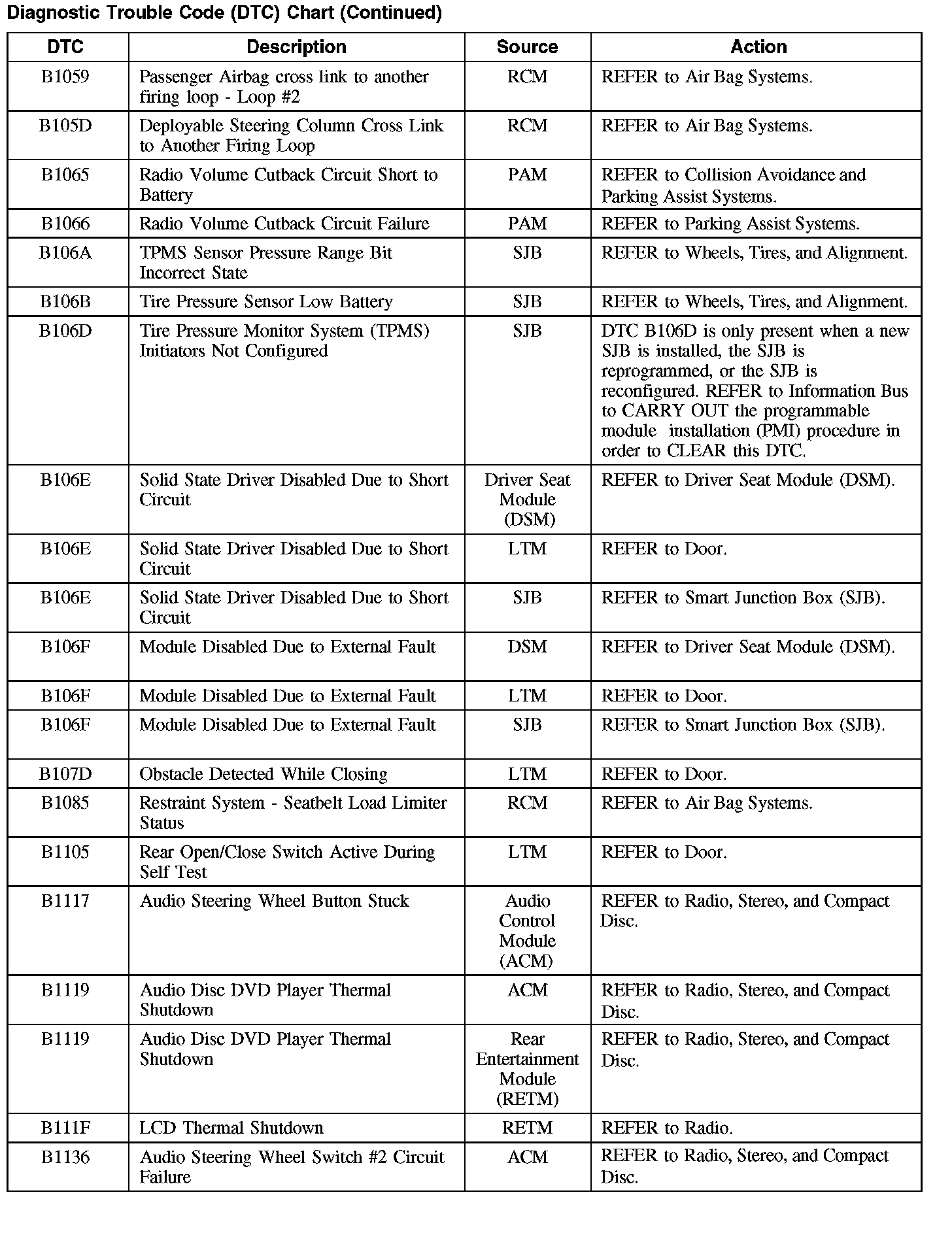 Home >> Ford >> 2008 >> Taurus FWD V6-3.5L >> Repair and Diagnosis >> Body and Frame >> Body Control Systems >> Testing and Inspection >> Diagnostic Trouble Code Descriptions >> Diagnostic Trouble Code (DTC) Chart