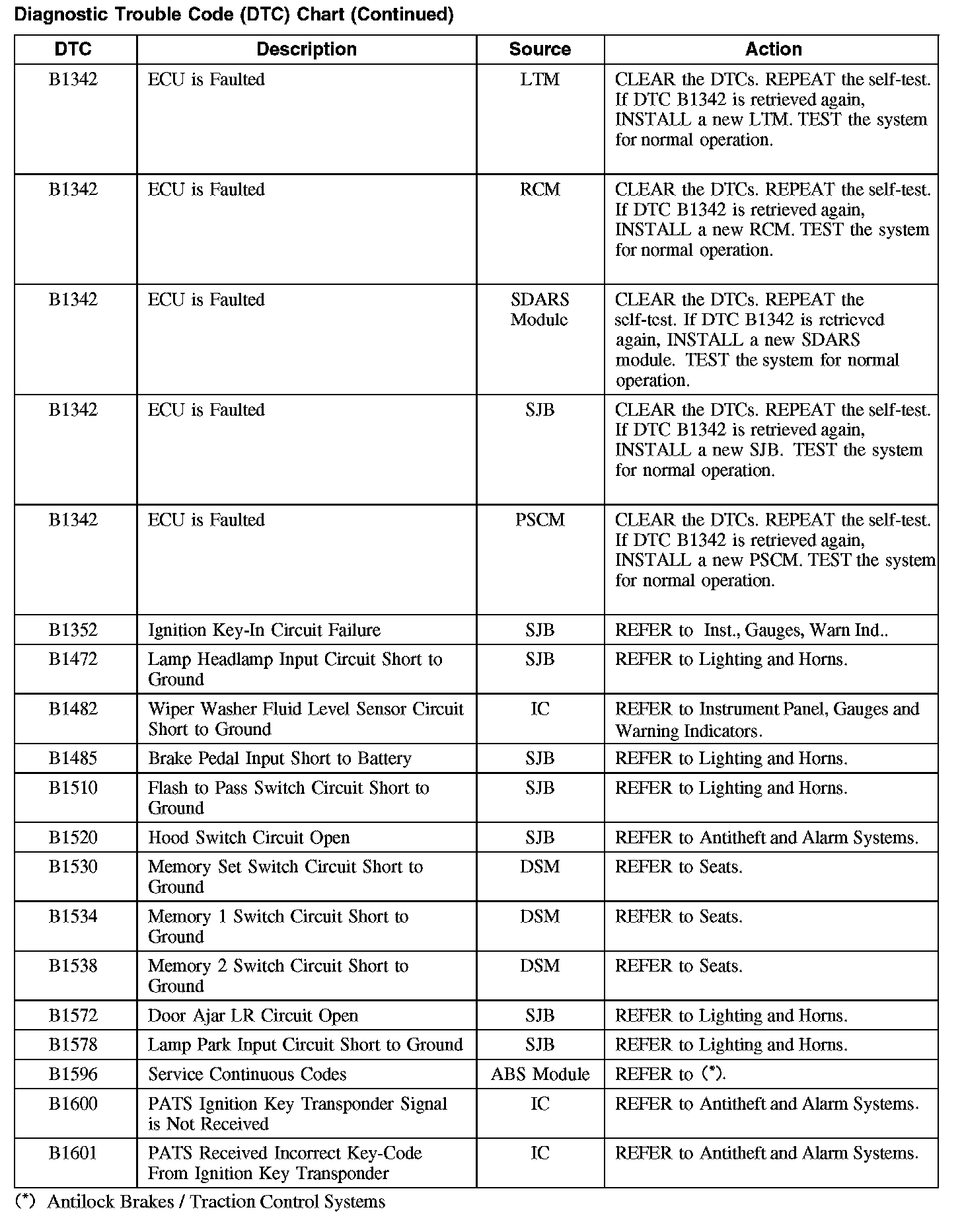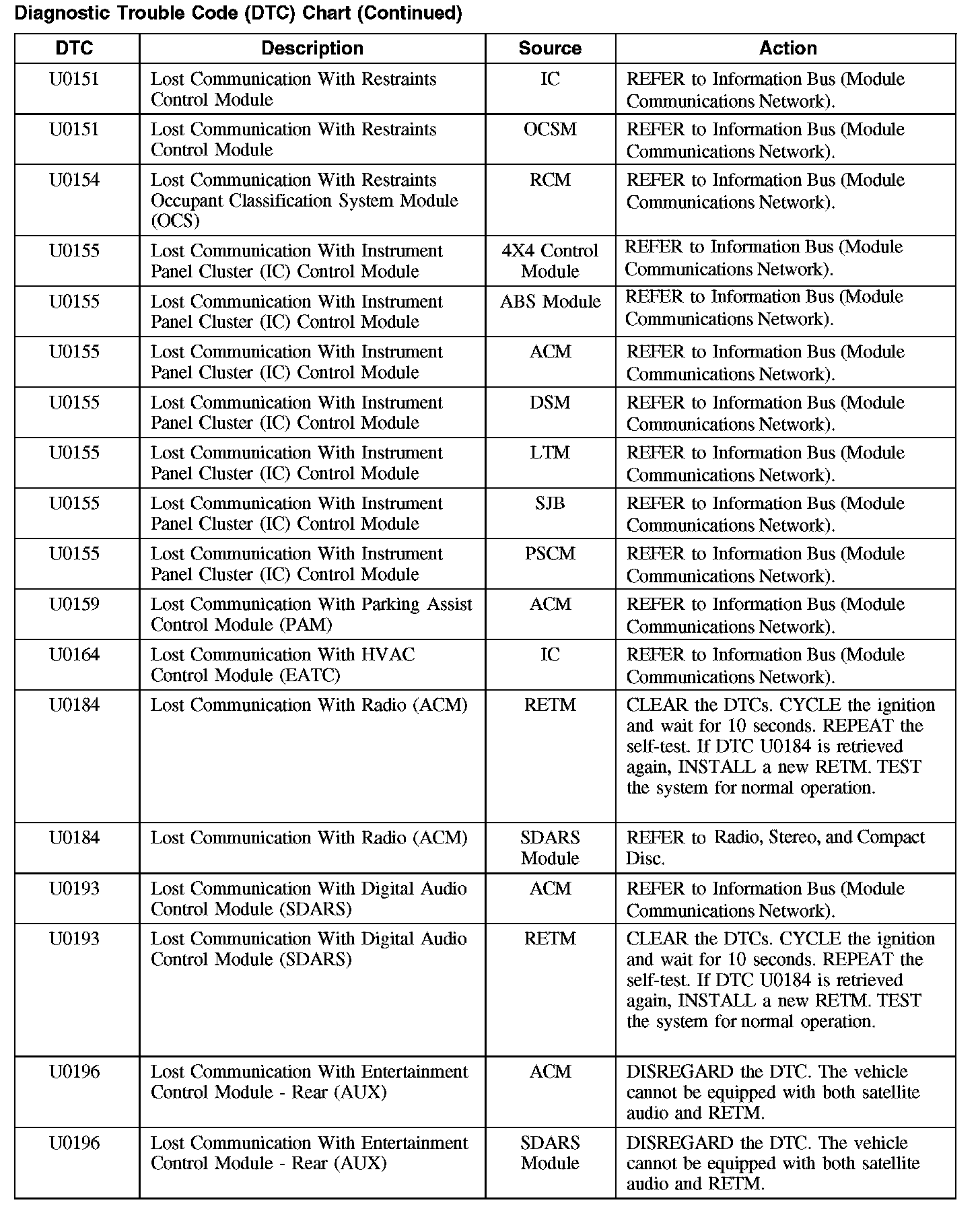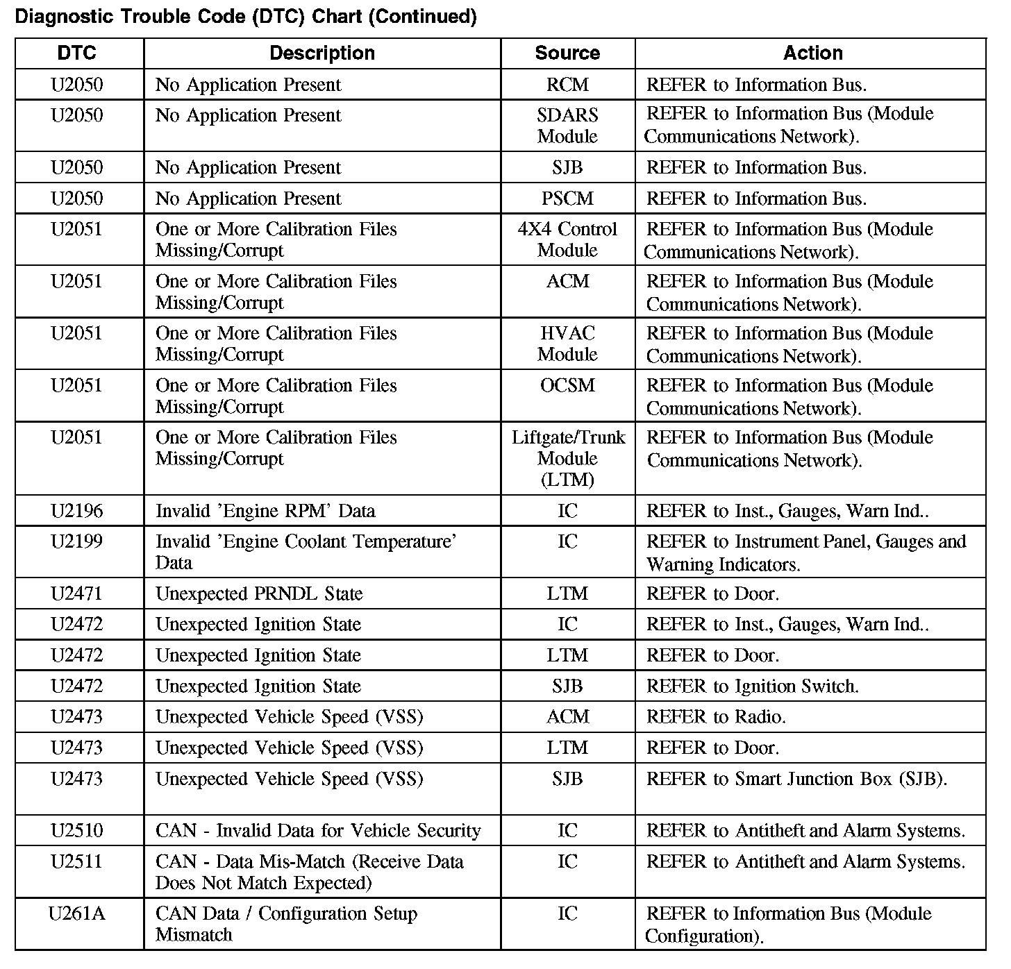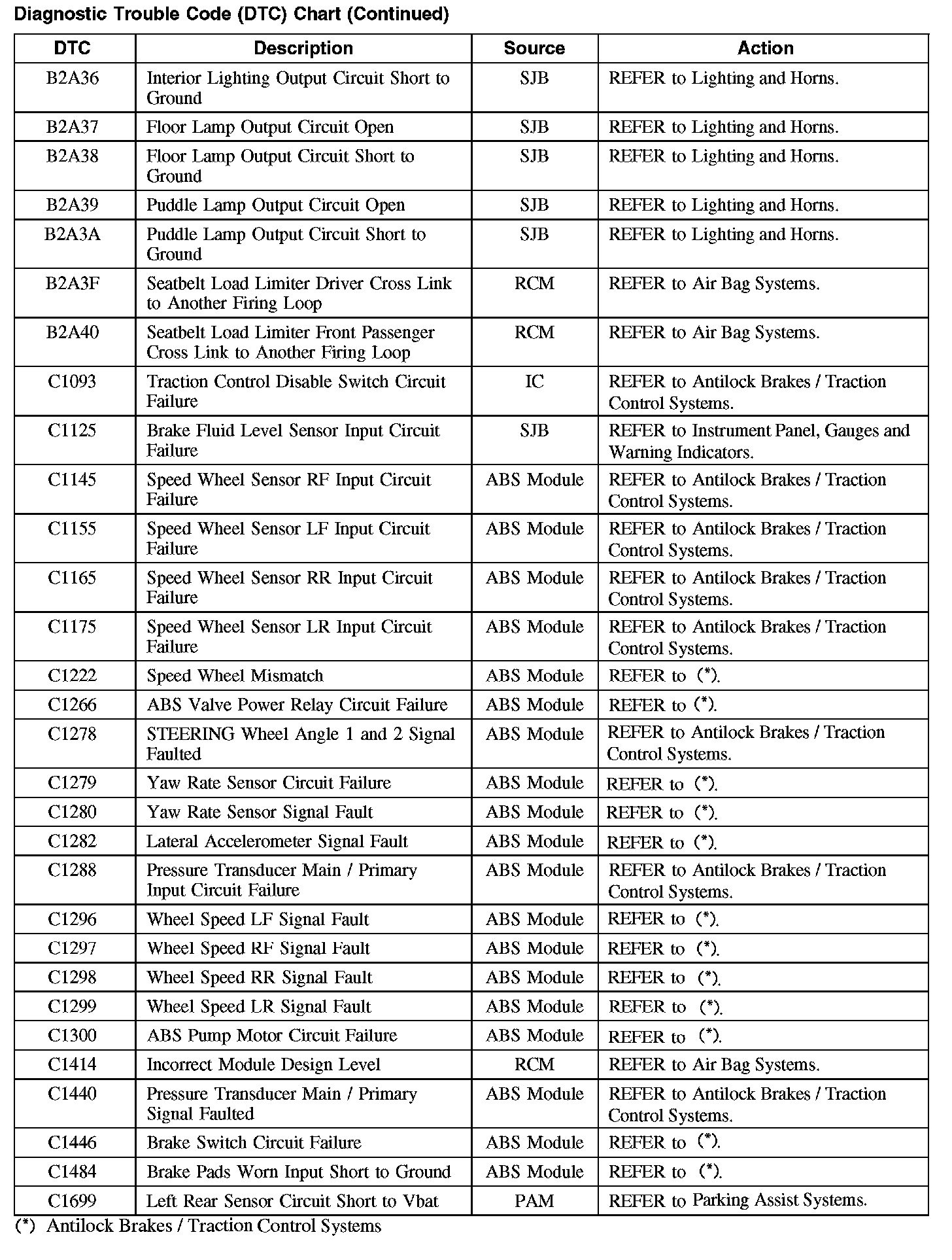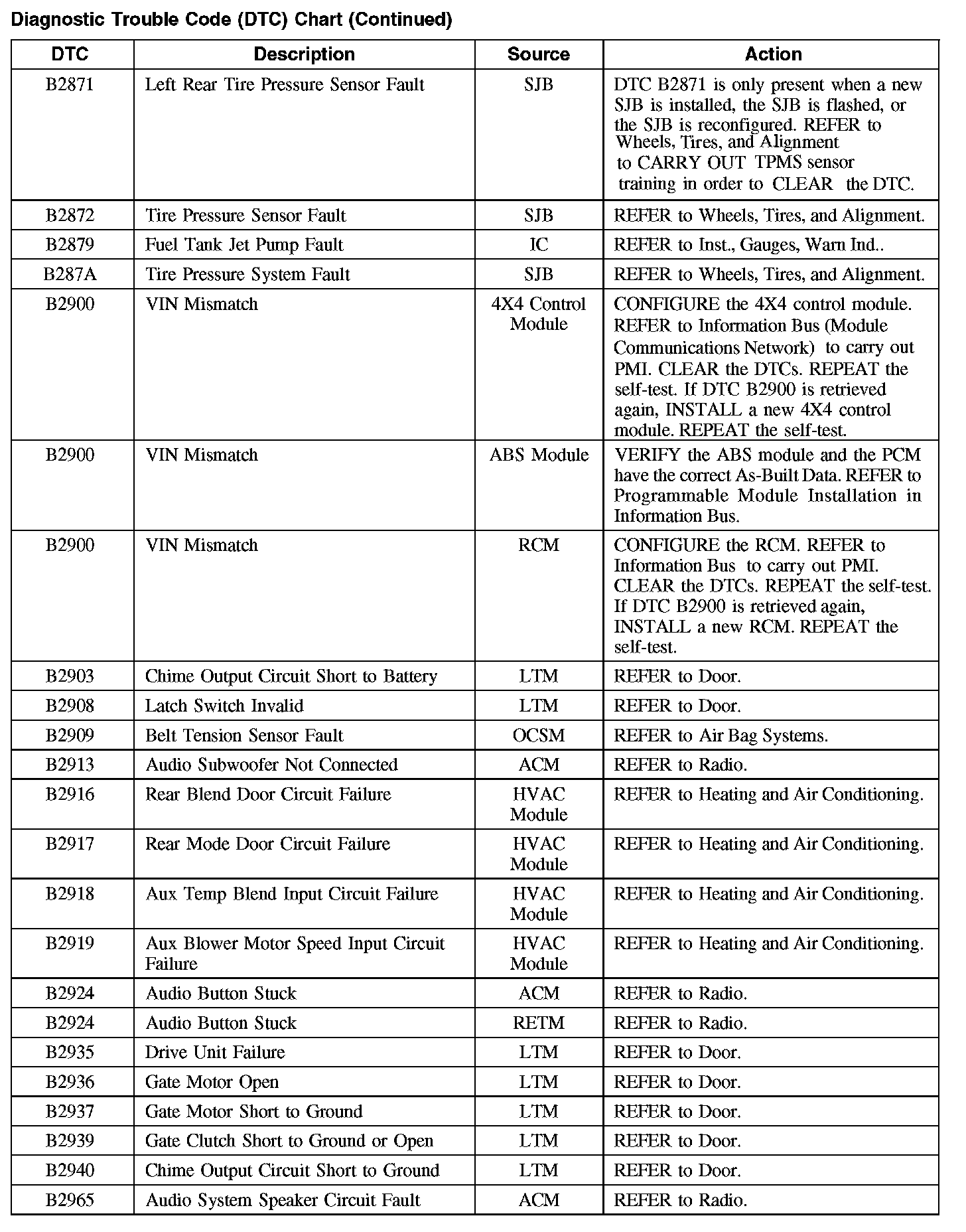 Home >> Ford >> 2008 >> Taurus FWD V6-3.5L >> Repair and Diagnosis >> Body and Frame >> Body Control Systems >> Testing and Inspection >> Diagnostic Trouble Code Descriptions >> Diagnostic Trouble Code (DTC) Chart