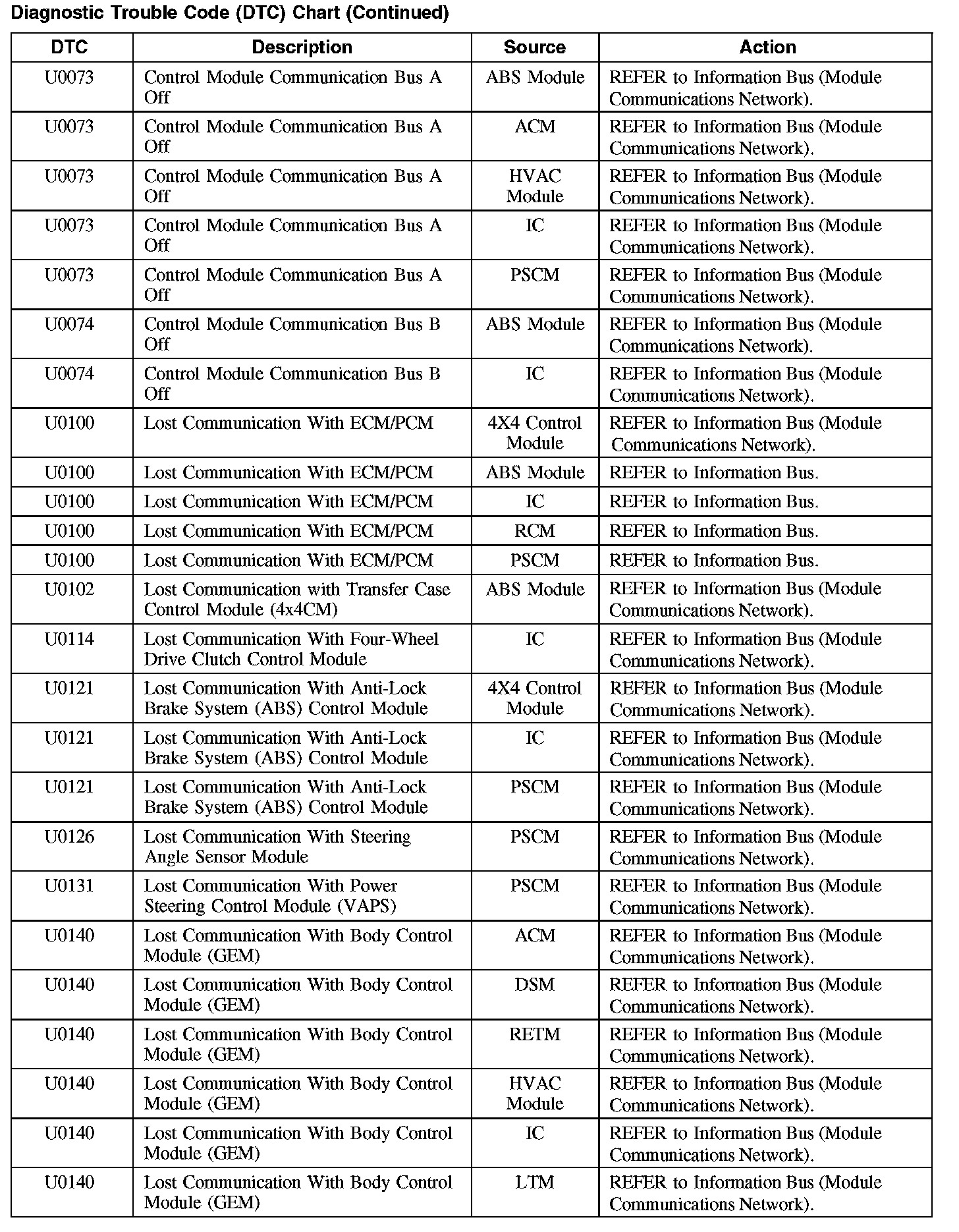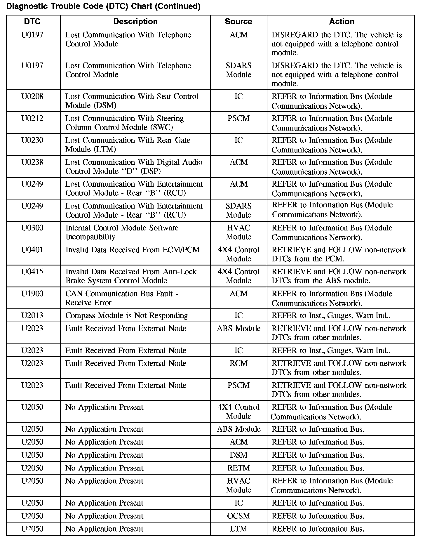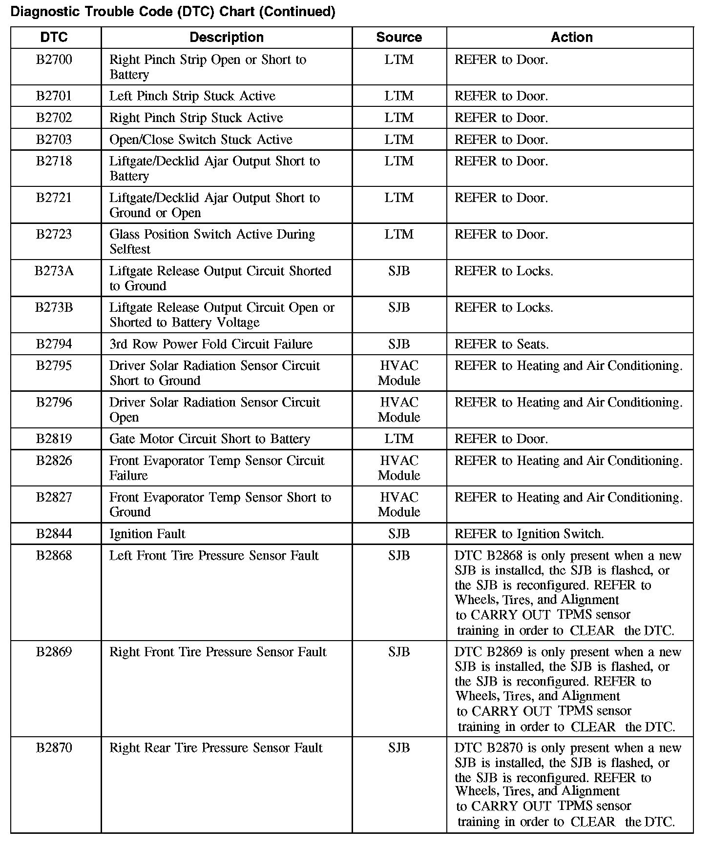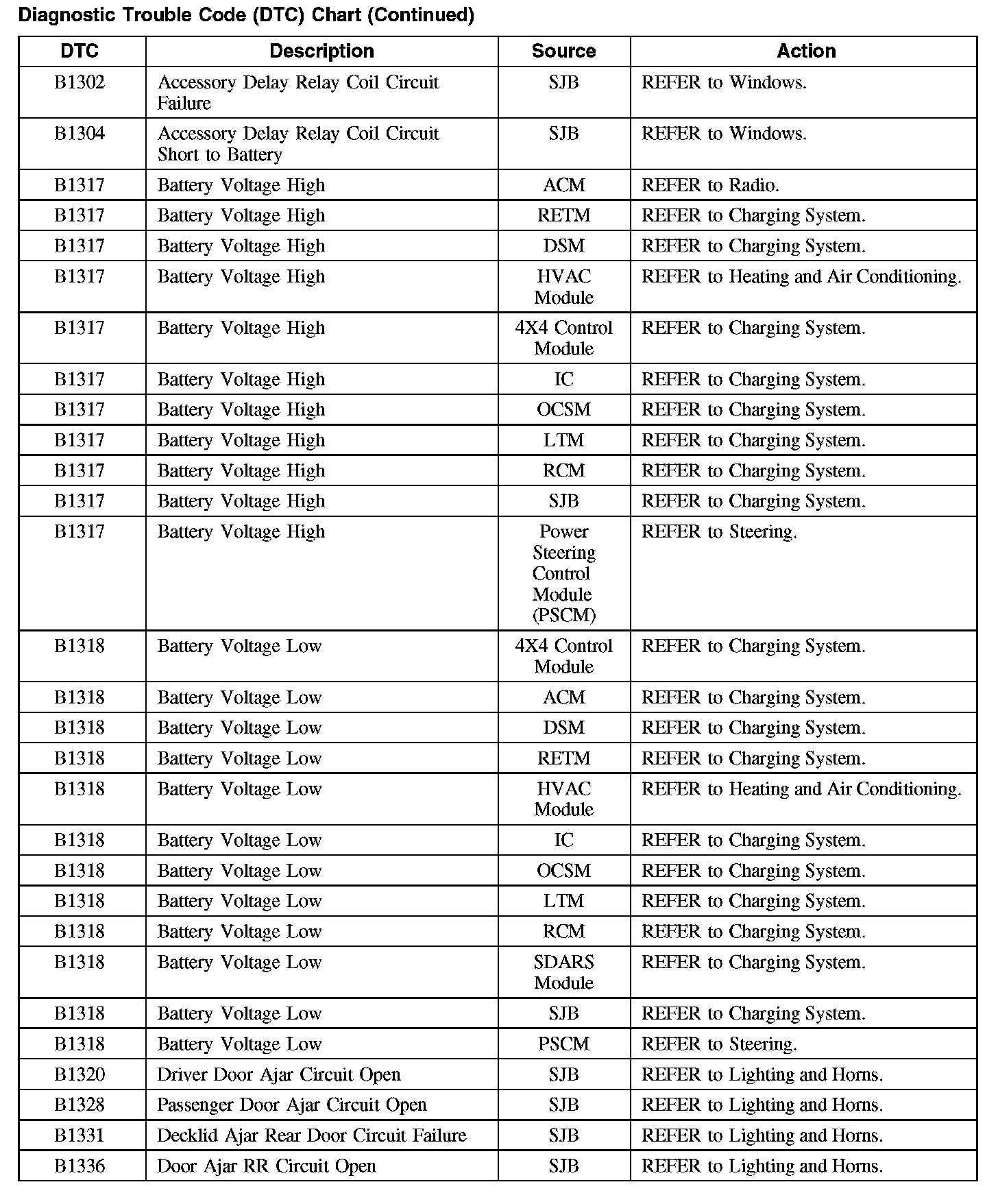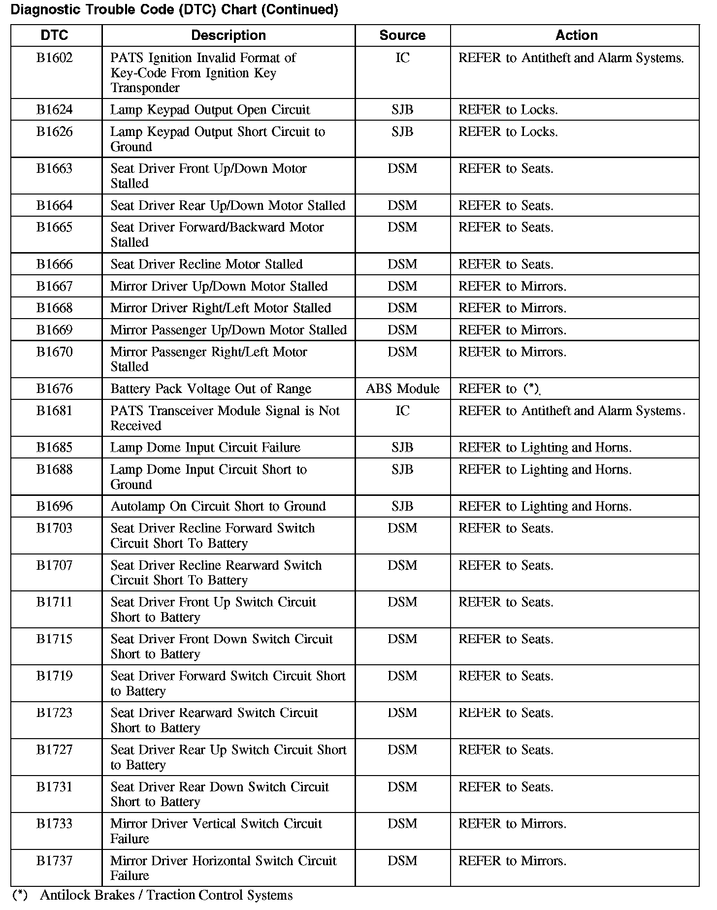 Home >> Ford >> 2008 >> Taurus FWD V6-3.5L >> Repair and Diagnosis >> Body and Frame >> Body Control Systems >> Testing and Inspection >> Diagnostic Trouble Code Descriptions >> Diagnostic Trouble Code (DTC) Chart
