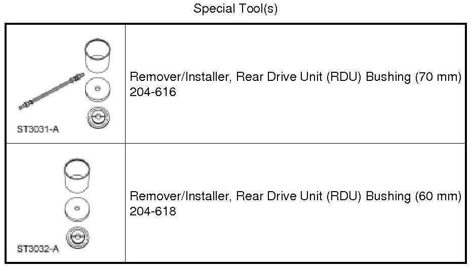 2. NOTE: Make sure the Rear Drive Unit (RDU) Bushing Remover/Installers are positioned with the larger opening toward the bushing to act as the receiver cup.