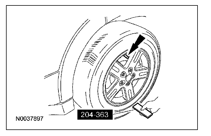Place the activation tool on the LF tire sidewall opposite (180 degrees) from the valve stem. Press and release the test button on the special tool. The horn will sound briefly to indicate that the tire pressure sensor has been recognized by the SJB.