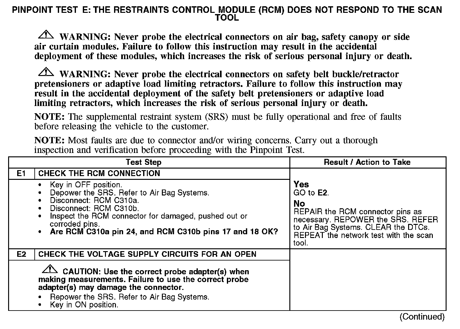 PINPOINT TEST E: THE RESTRAINTS CONTROL MODULE (RCM) DOES NOT RESPOND TO THE SCAN TOOL
