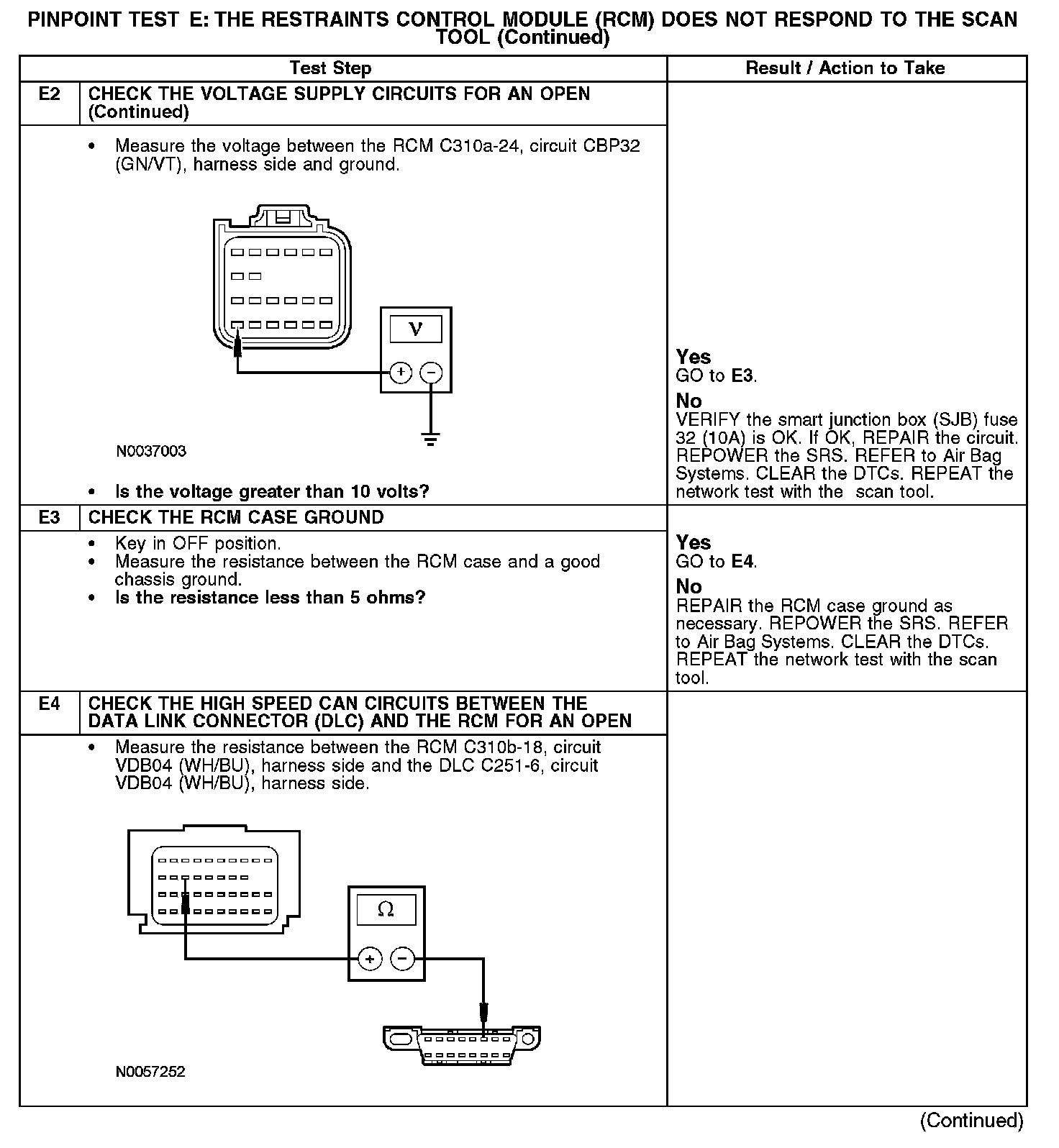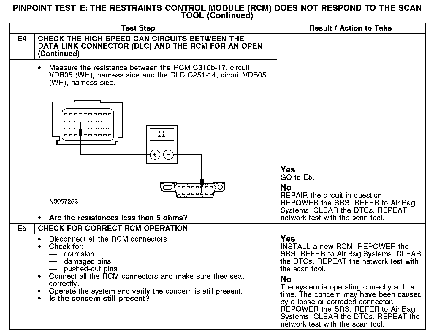 Home >> Ford >> 2008 >> Taurus FWD V6-3.5L >> Repair and Diagnosis >> Powertrain Management >> Computers and Control Systems >> Information Bus >> Testing and Inspection >> Pinpoint Tests >> Test E: The Restraints Control Module (RCM) Does Not Respond To The Scan Tool