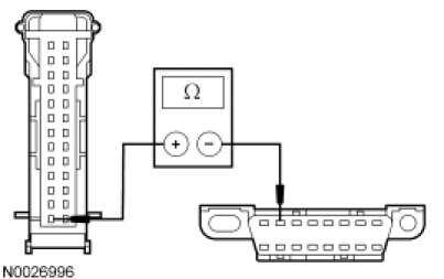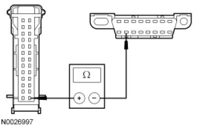 - Measure the resistance between the DDM C501a-14, circuit 915 (PK/LB), harness side and the DLC C251-10, circuit 915 (PK/LB), harness side.