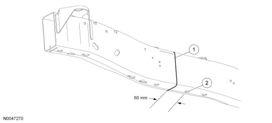 1. Scribe a vertical cut line 60 mm (2.36 in) in front of the No. 2 crossmember locating hole.