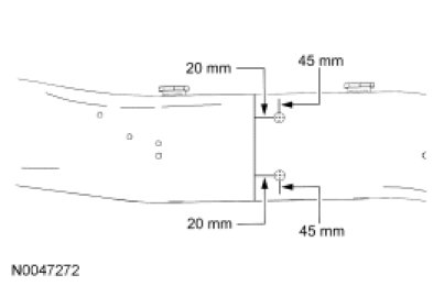 12. Drill four 10 mm (0.39 in) holes in the damaged frame, inner and outer surfaces, to aid plug welding of the inner reinforcement sleeve. Hole locations are 20 mm (0.78 in) to the rear of the cut line and 45 mm (1.77 in) from the top and bottom surfaces.