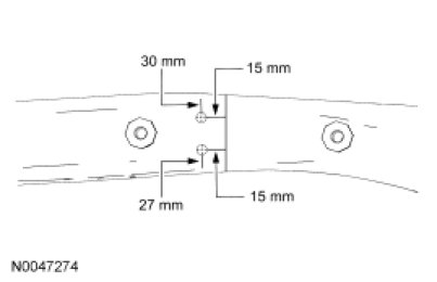 15. Drill four 10 mm (0.39 in) holes in the service replacement frame, top and bottom surfaces, to aid future plug welding of the inner reinforcement sleeve. Hole locations are 15 mm (0.59 in) forward of cut line 3 (previously scribed), and 27 mm (1.06 in) and 30 mm (1.18 in) from the edge of the frame rail.
