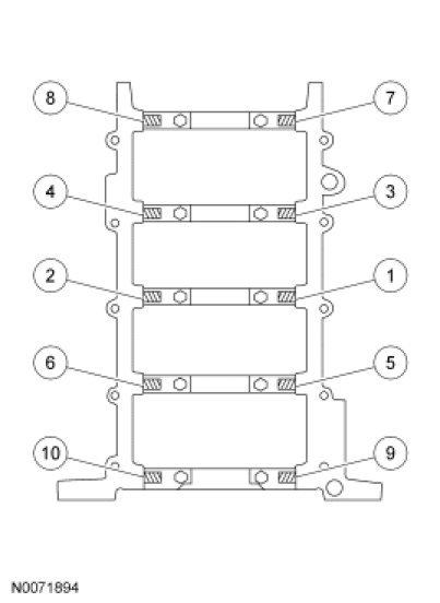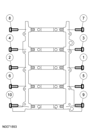 Tighten the 10 main bearing cap bolts in 2 stages, in the sequence shown.