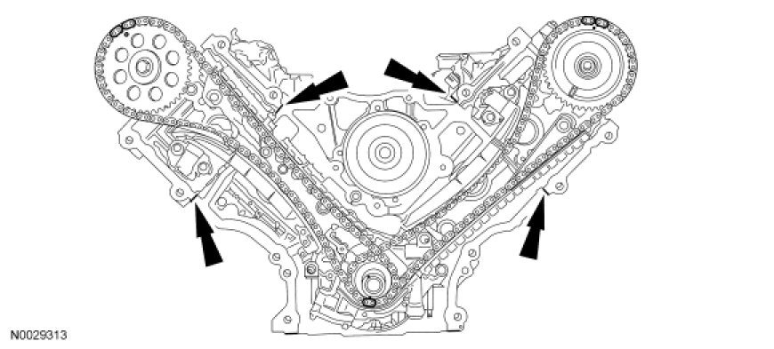 NOTICE: Unless otherwise instructed, at no time when the timing chains are removed and the cylinder heads are installed is the crankshaft or camshaft to be rotated. Severe piston and valve damage will occur.
