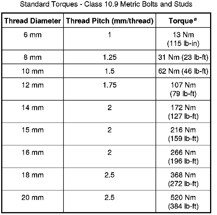 Standard Torques - Class 10.9 Metric Bolts And Studs: