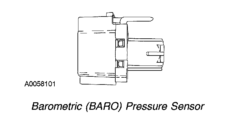 The BARO pressure sensor is a variable capacitor sensor that processes a signal indicating atmospheric pressure. This allows the PCM to compensate for altitude. The PCM uses this information to calculate injection timing and glow plug control. At higher altitudes, glow plug on time is increased to reduce start-up smoke. The BARO sensor is located behind the instrument panel steering column cover.