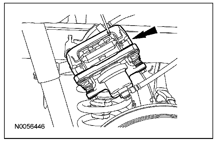 7. NOTICE: Do not allow the brake caliper and anchor plate assembly to hang from the brake hose or damage to the hose may occur.