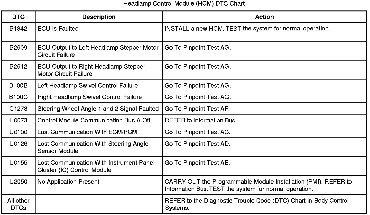 Headlamp Control Module (HCM) DTC Chart