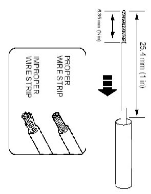 2. Strip 6.35mm (1/4 in) of insulation from each wire end, taking care not to nick or cut wire strands.
