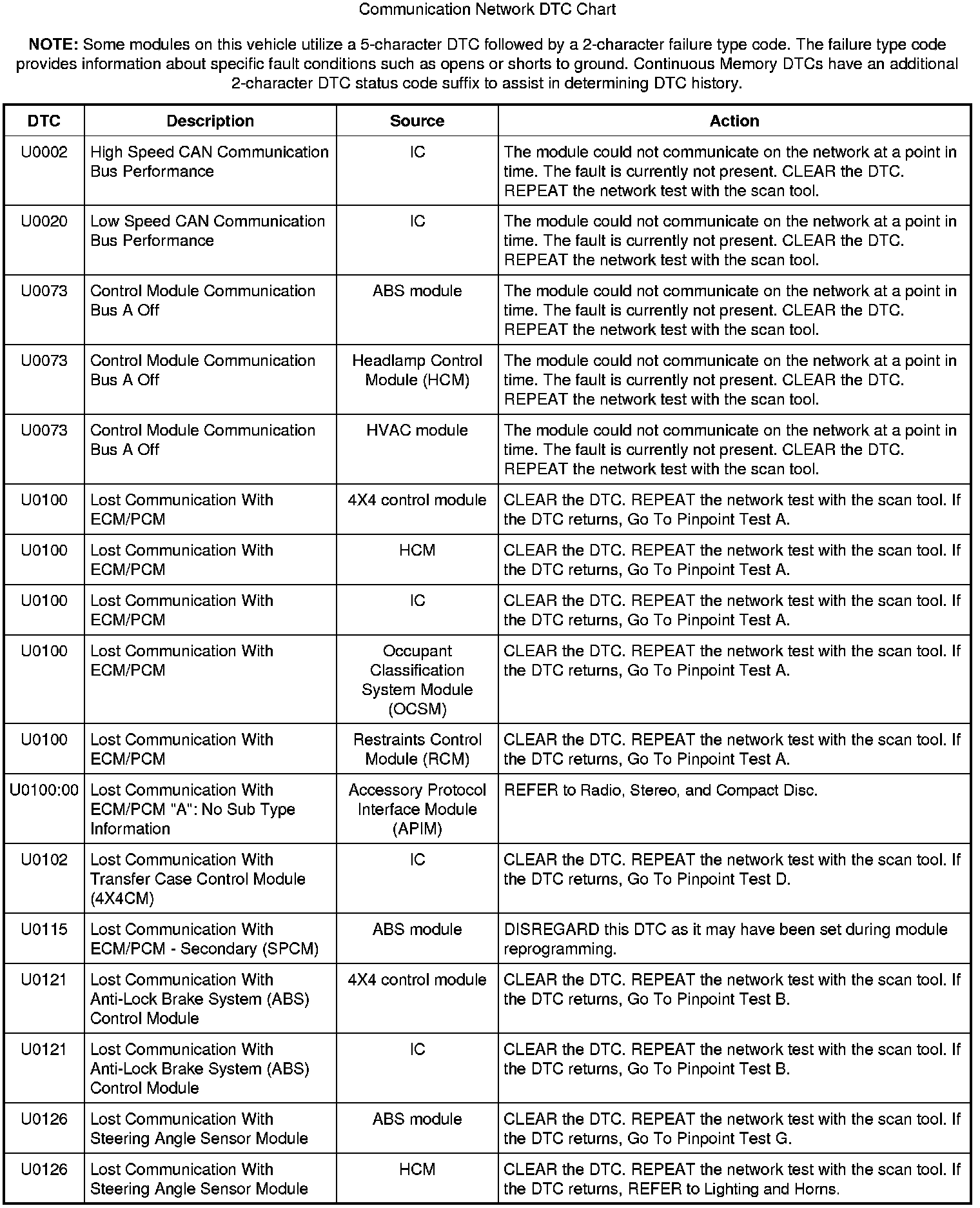 NOTE: Network DTCs (U-codes) are often a result of intermittent concerns such as faulty wiring or low battery voltage occurrences. Additionally, vehicle service procedures such as module reprogramming will often set network DTCs. Replacing a module to resolve a network DTC is unlikely to resolve the concern. To prevent repeat network DTC concerns, inspect all network wiring, especially connectors. Test the vehicle battery, refer to Battery.