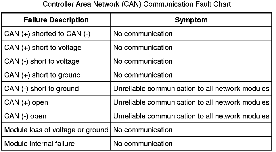 The following fault chart describes the specific CAN failures and their resulting symptom: