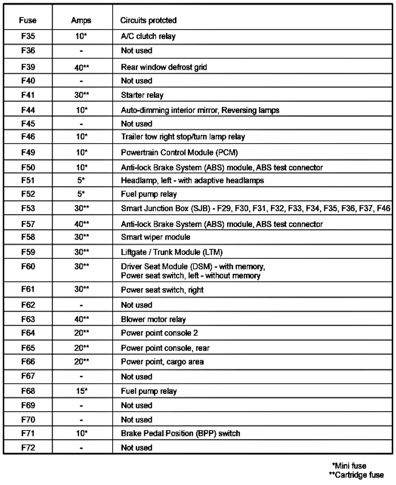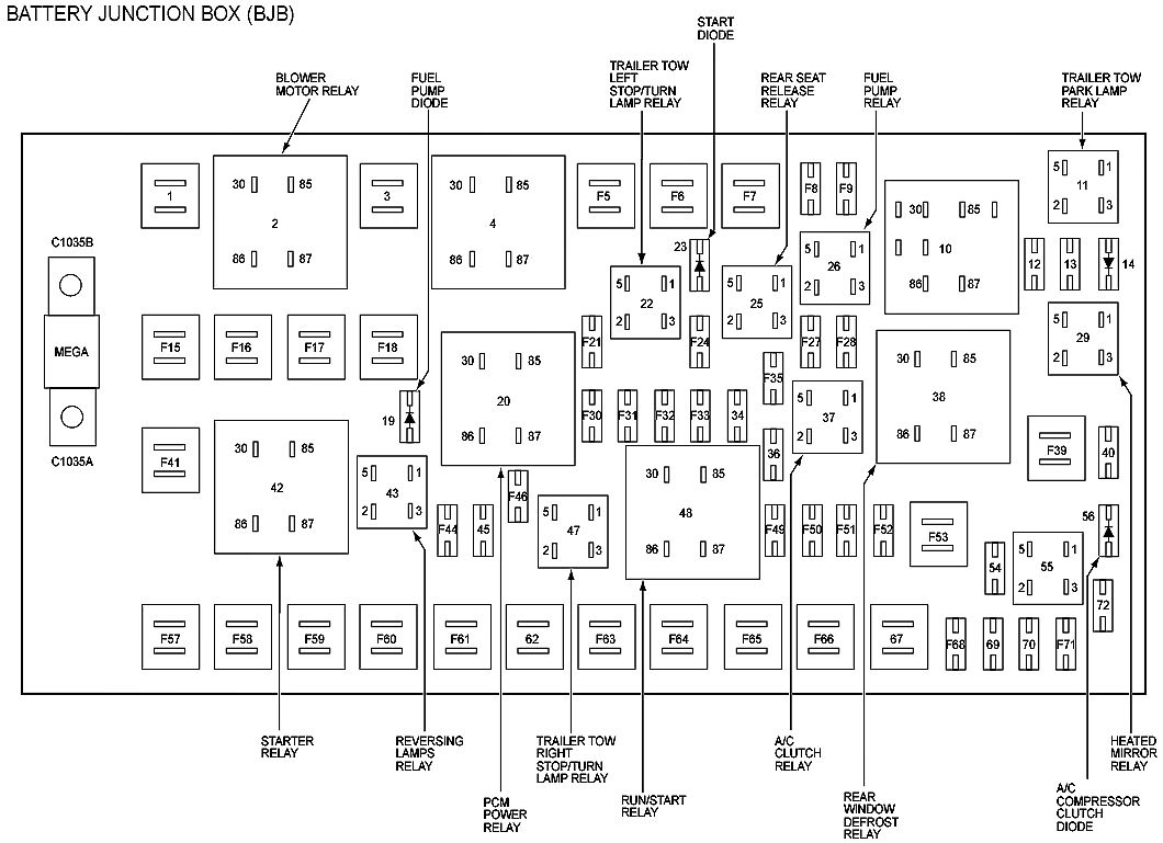 ALLDATA Editor's Note: Ford identifies this one component by 2 different names. Users have reported success comparing these images to determine Application/ID or Location of Fuses and Relays with the Power Distribution Box / Battery Junction Box (BJB).
