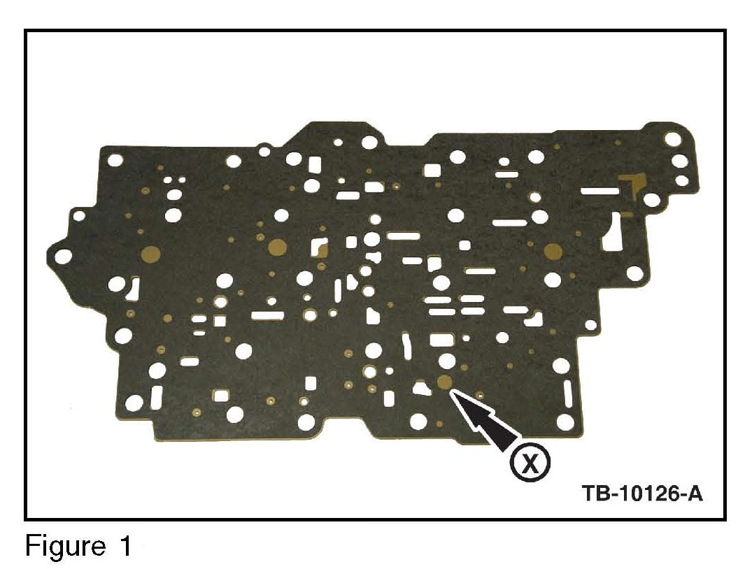 4. Replace the separator plate in the valve body. The X identifies the hole in the valve body separator plate which will be eliminated. (Figure 1)