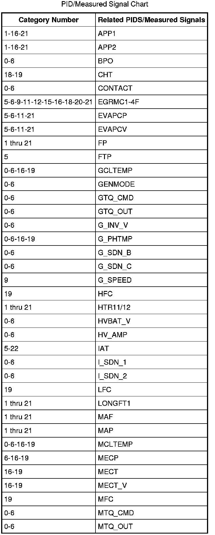 The listing reflects PIDS and/or measured values which may reveal a possible concern within each system shown. Match the category number with the related PID/measured signal and go to the Typical Diagnostic Reference Value Charts.