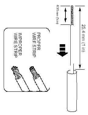 2. Strip 6.35mm (1/4 in) of insulation from each wire end, taking care not to nick or cut wire strands.