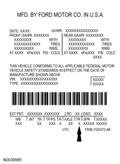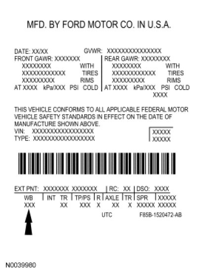 The upper portion of the Vehicle Certification (VC) label contains the manufacturer's name, the month and year of manufacture, the certification statement and the VIN. It also includes Gross Vehicle Weight Rating (GVWR). The VC label is located on the left-hand door jamb. The serial number can also be found on the engine block, transmission and frame.