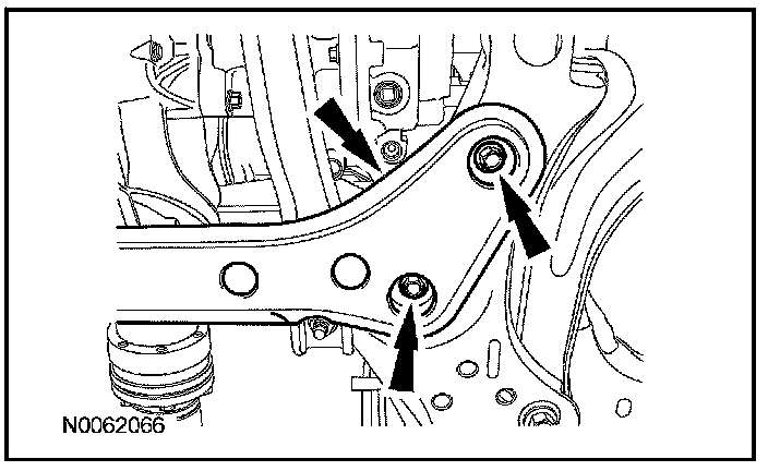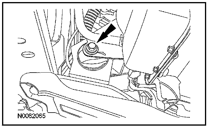 13. Remove the nut and the engine support crossmember. Discard the nut.