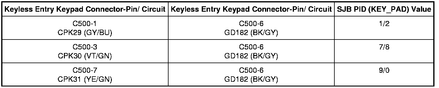 - Connect a fused jumper wire between the keyless entry keypad harness side, while monitoring the SJB PID (KEY_PAD) as follows: