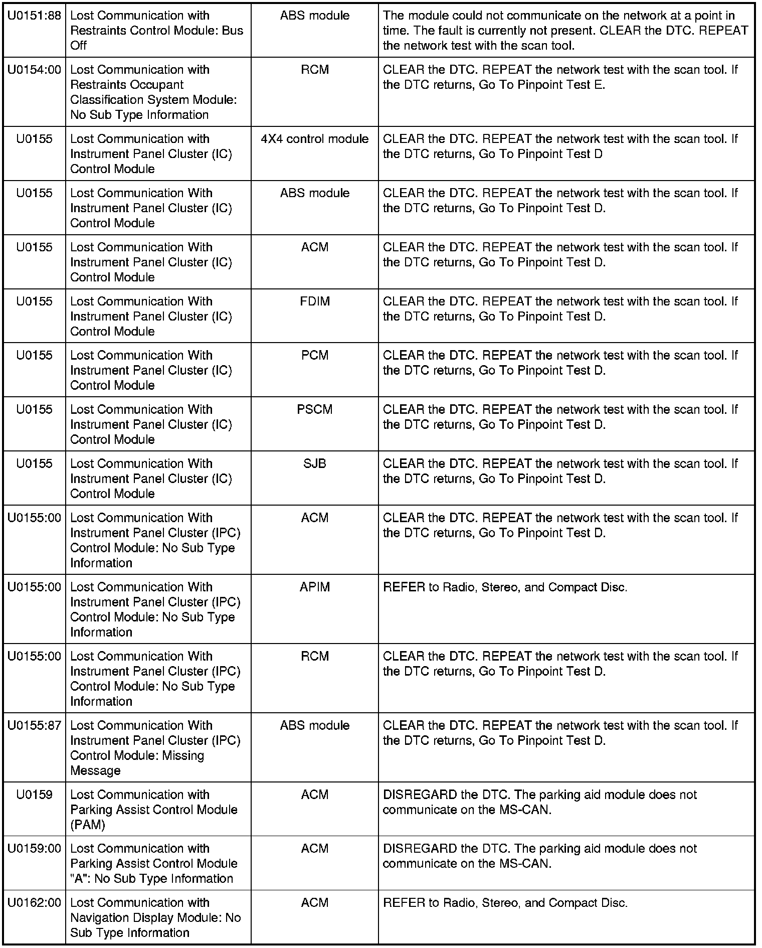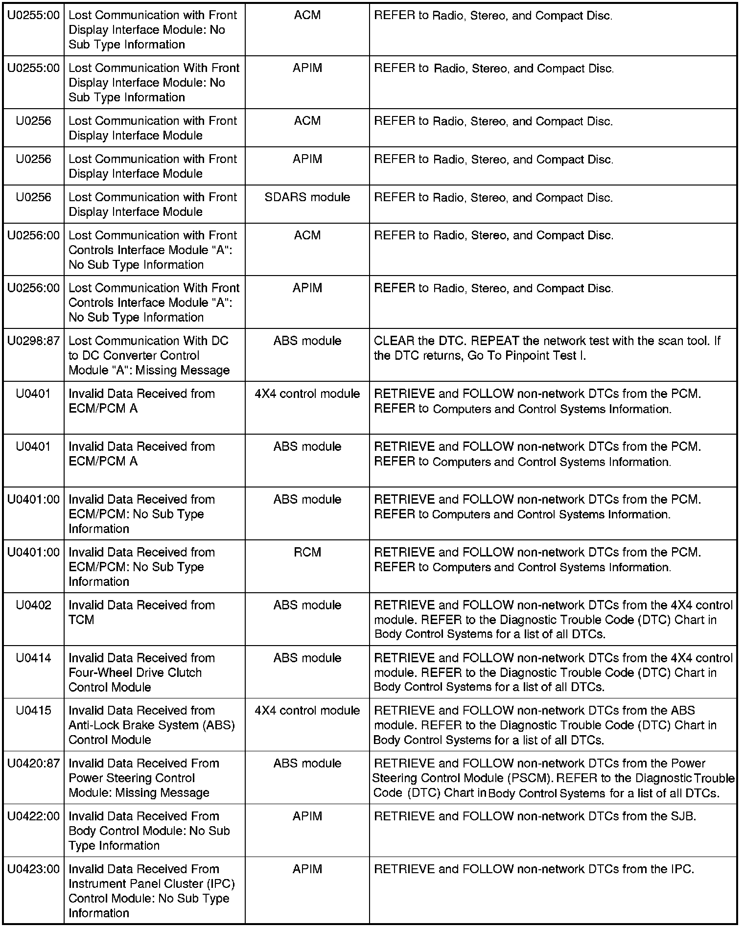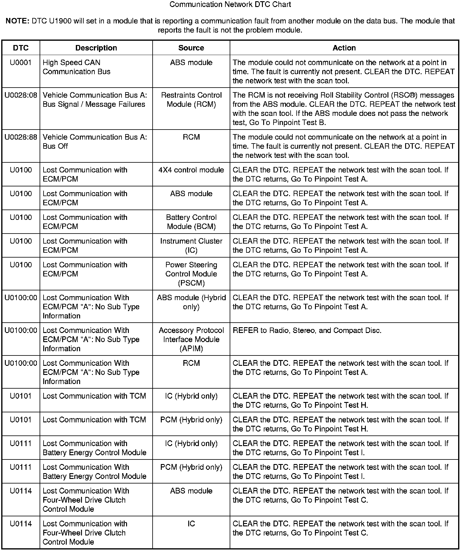 NOTE: Network DTCs (U-codes) are often a result of intermittent concerns such as faulty wiring or low battery voltage occurrences. Additionally, vehicle service procedures such as module reprogramming will often set network DTCs. Replacing a module to resolve a network DTC is unlikely to resolve the concern. To prevent repeat network DTC concerns, inspect all network wiring, especially connectors. Test the vehicle battery, refer to Battery.