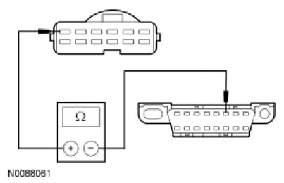 - Measure the resistance between the TCM C1458a-1, circuit VDB04 (WH/BU), harness side and the DLC C251-6, circuit VDB04 (WH/BU), harness side.