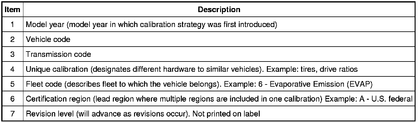 Powertrain calibration information is printed in the lower right corner of the VC label. Only the base calibration information is printed. Revision levels will not appear, however, they can be obtained through a scan tool using the most current software revision.