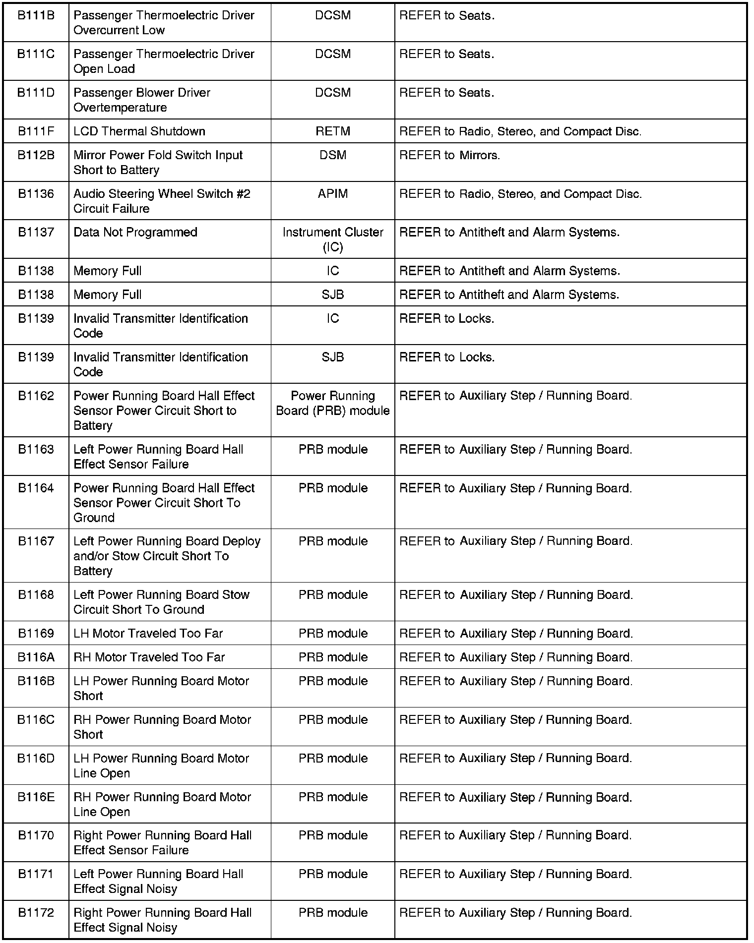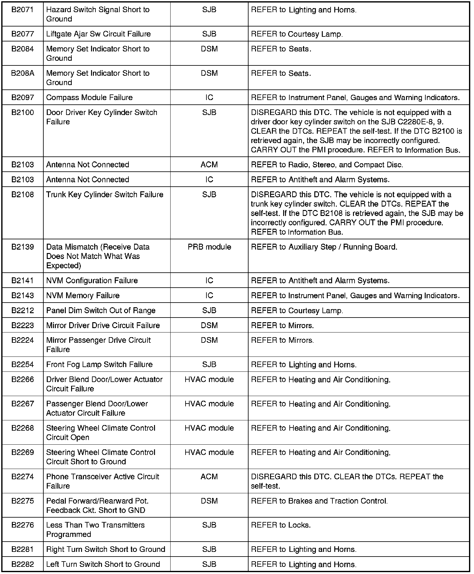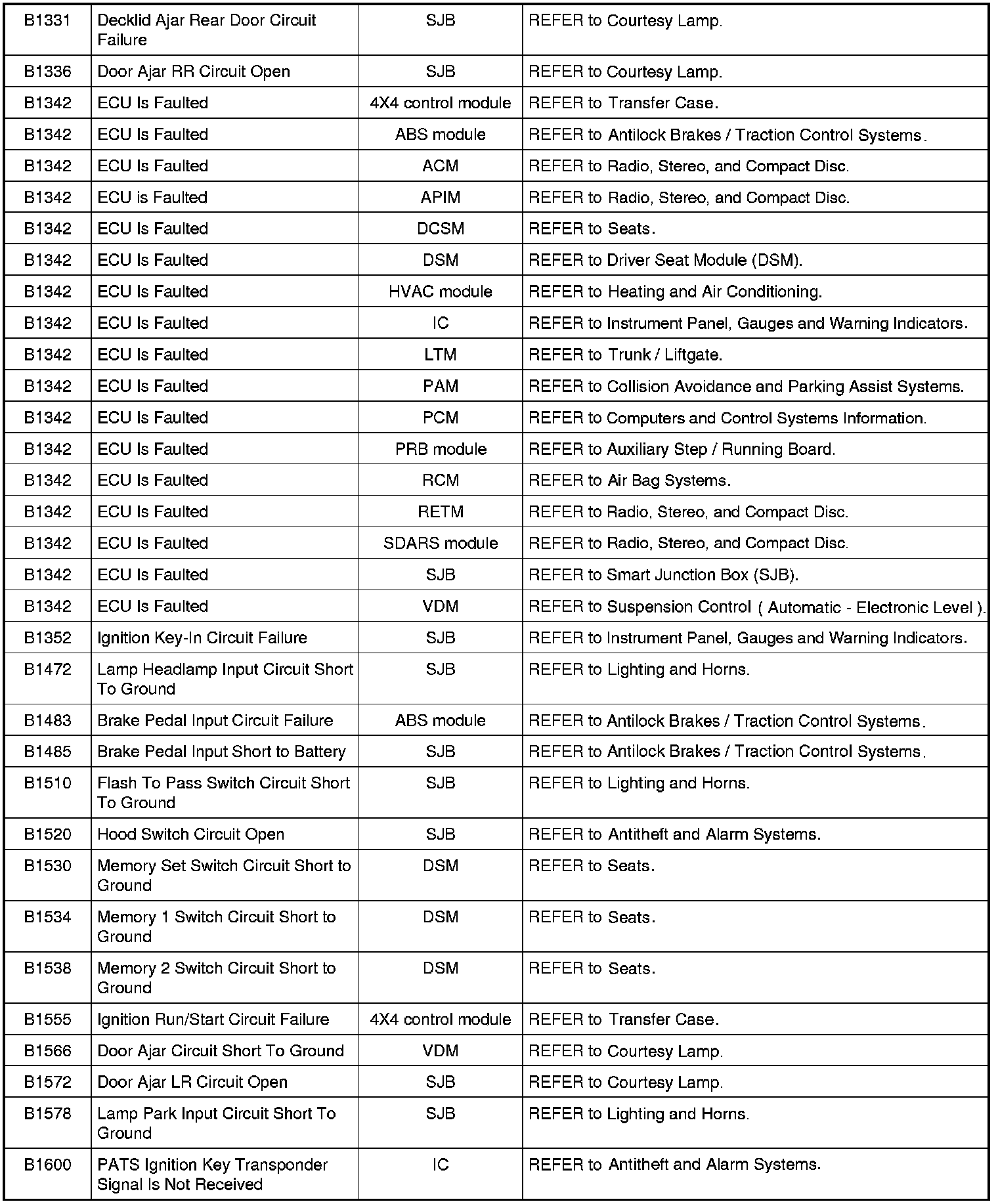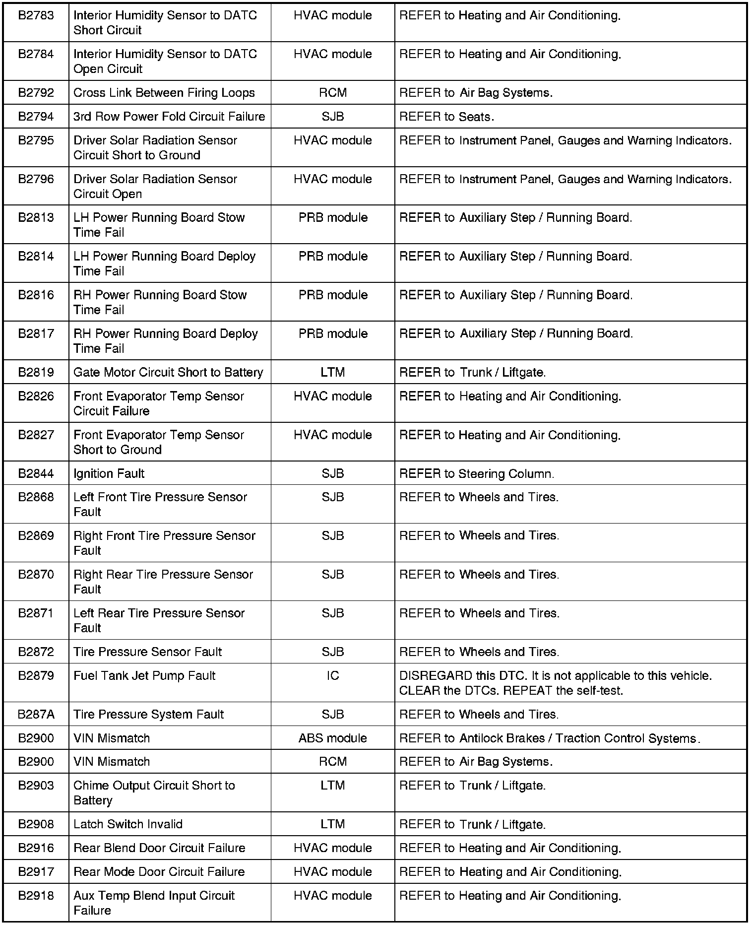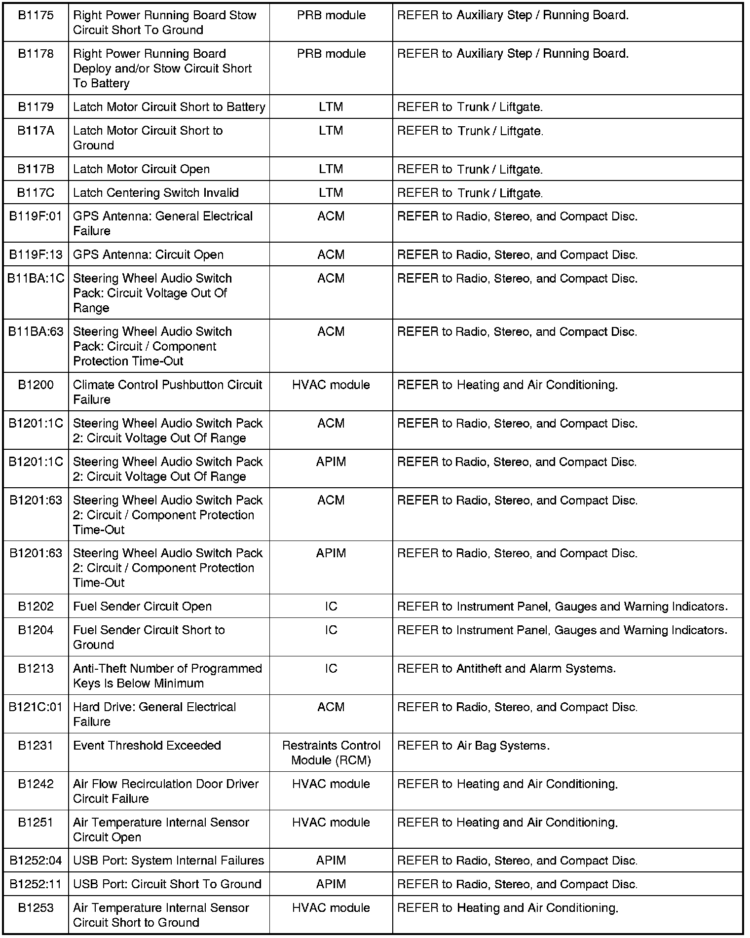 Home >> Ford >> 2009 >> Expedition 2WD V8-5.4L >> Repair and Diagnosis >> Body and Frame >> Body Control Systems >> Testing and Inspection >> Diagnostic Trouble Code Descriptions >> Diagnostic Trouble Code (DTC) Chart