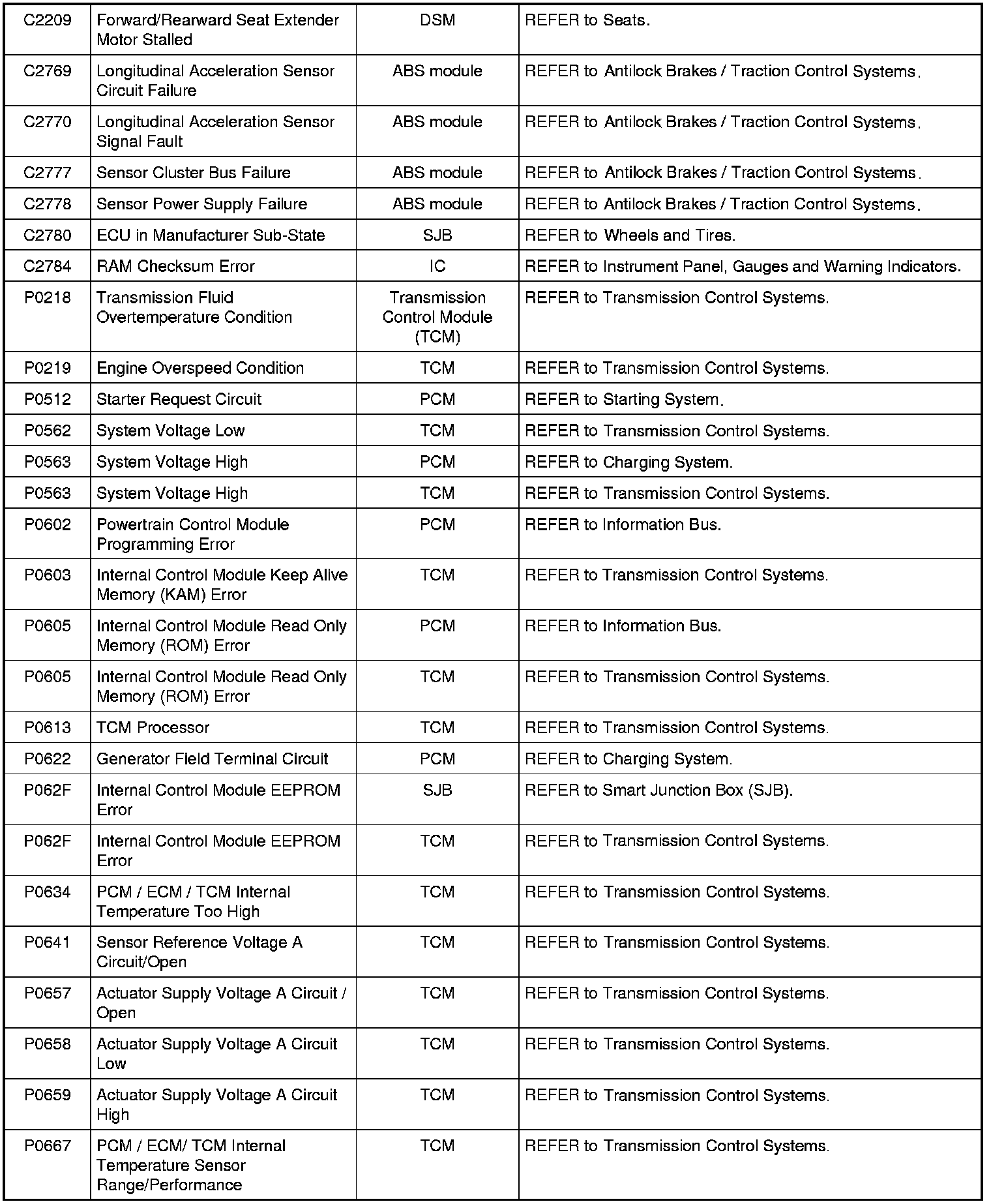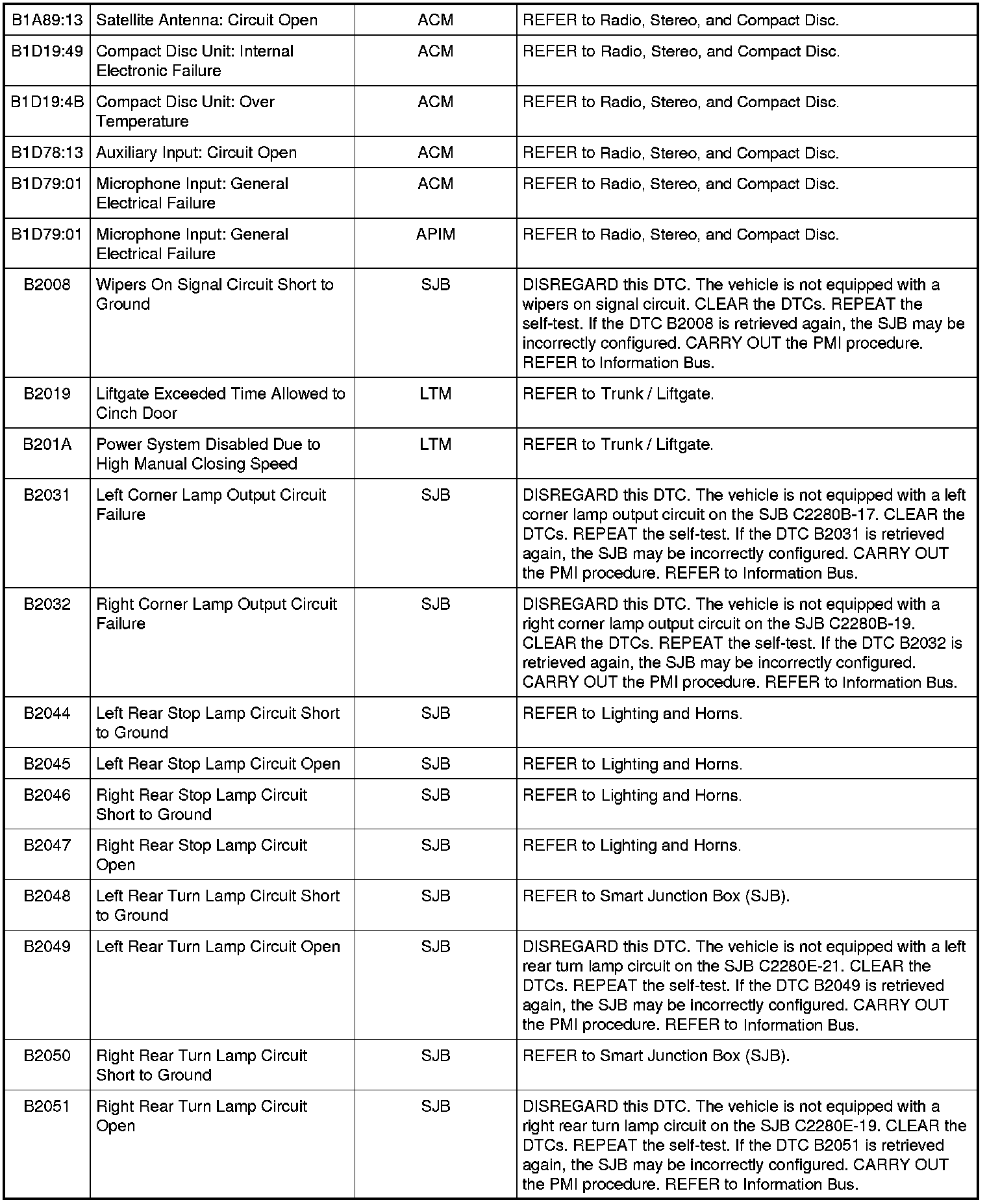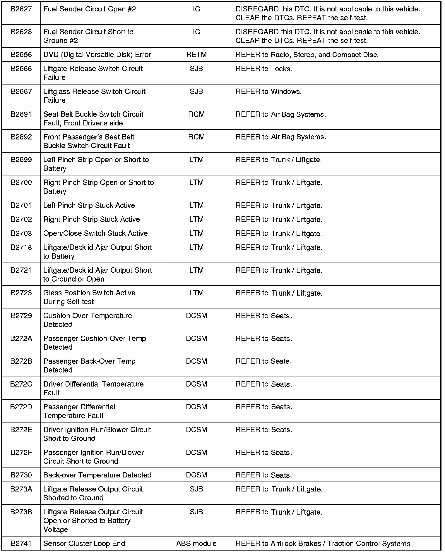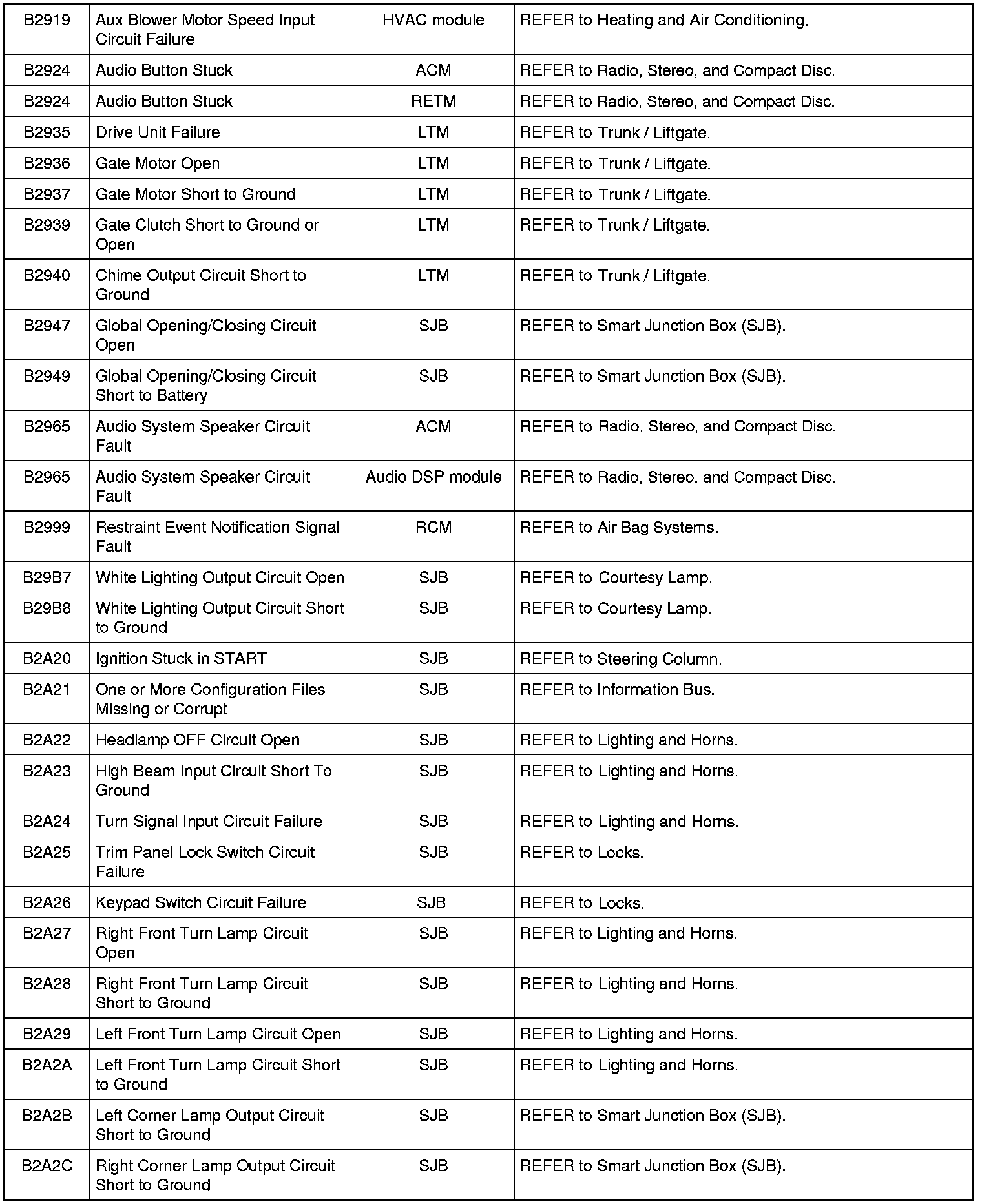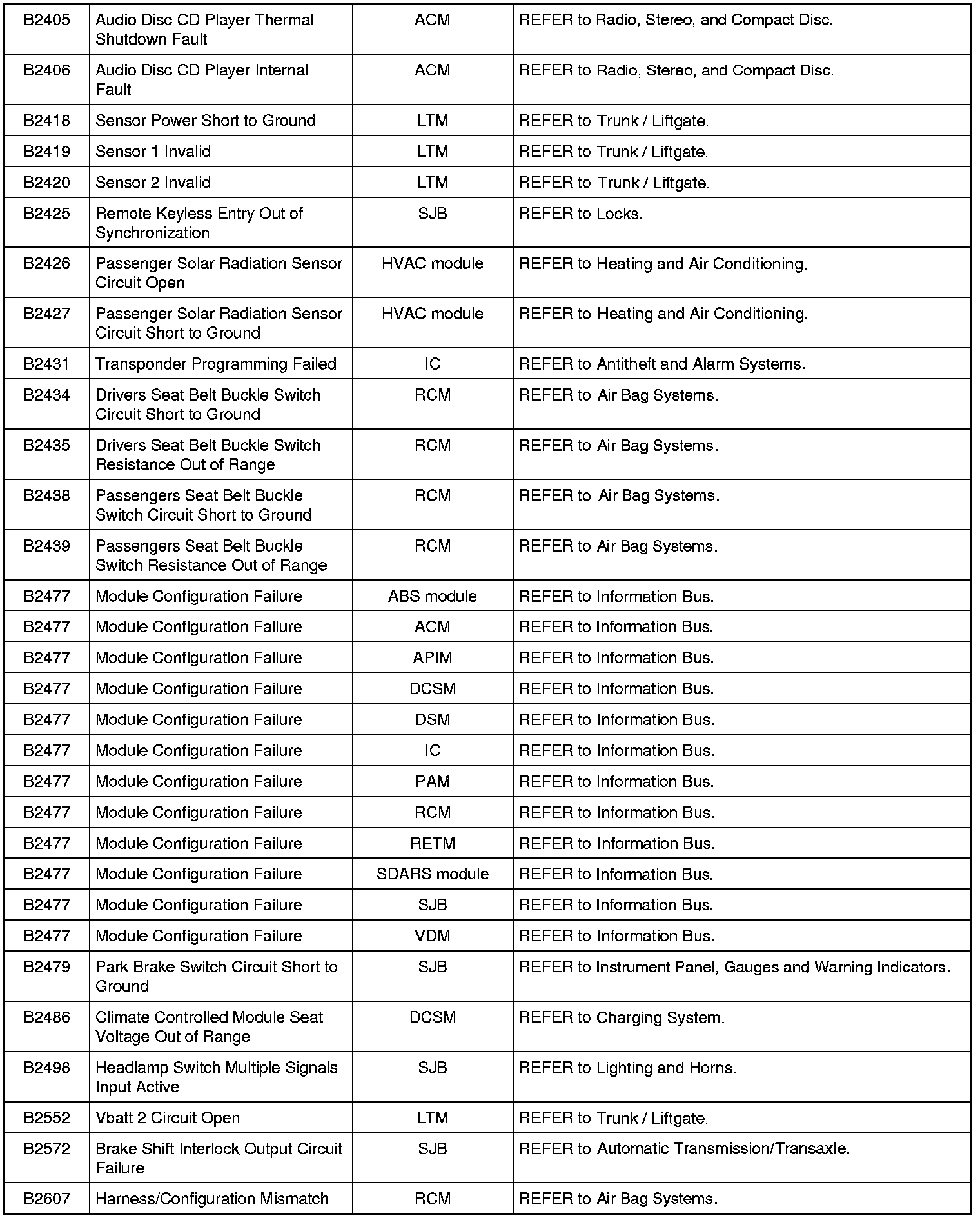 Home >> Ford >> 2009 >> Expedition 2WD V8-5.4L >> Repair and Diagnosis >> Body and Frame >> Body Control Systems >> Testing and Inspection >> Diagnostic Trouble Code Descriptions >> Diagnostic Trouble Code (DTC) Chart