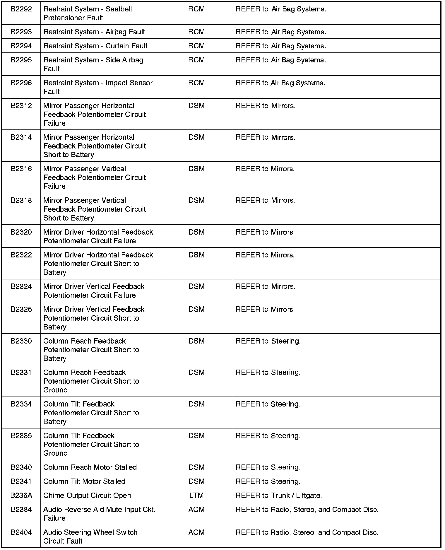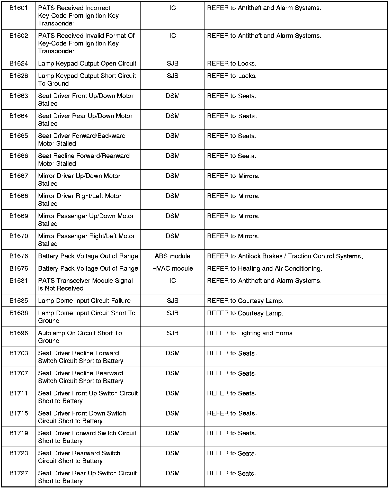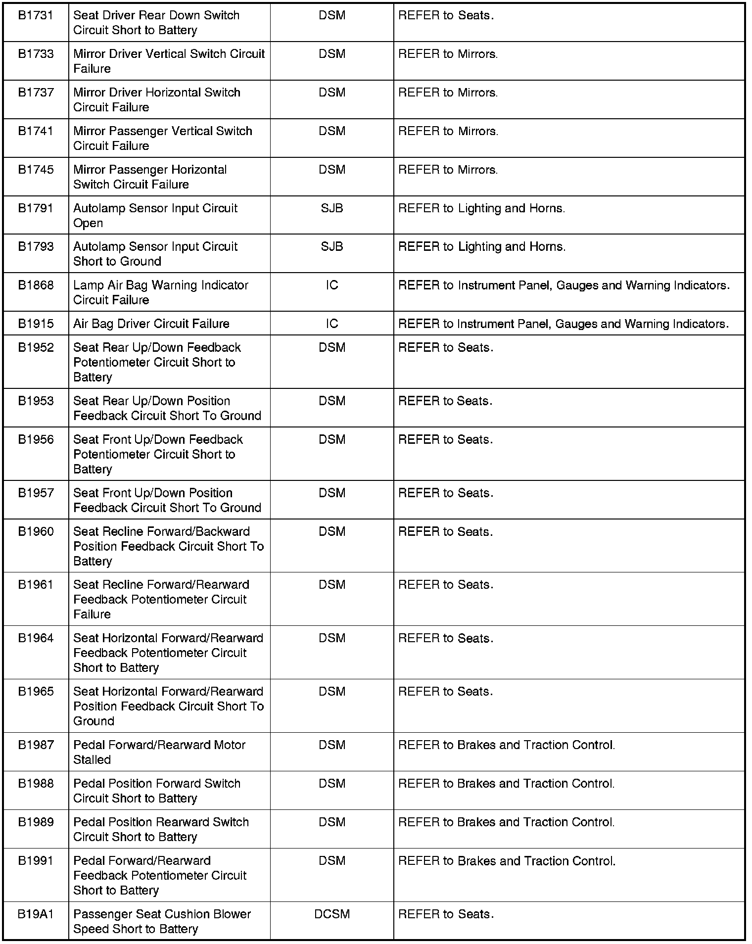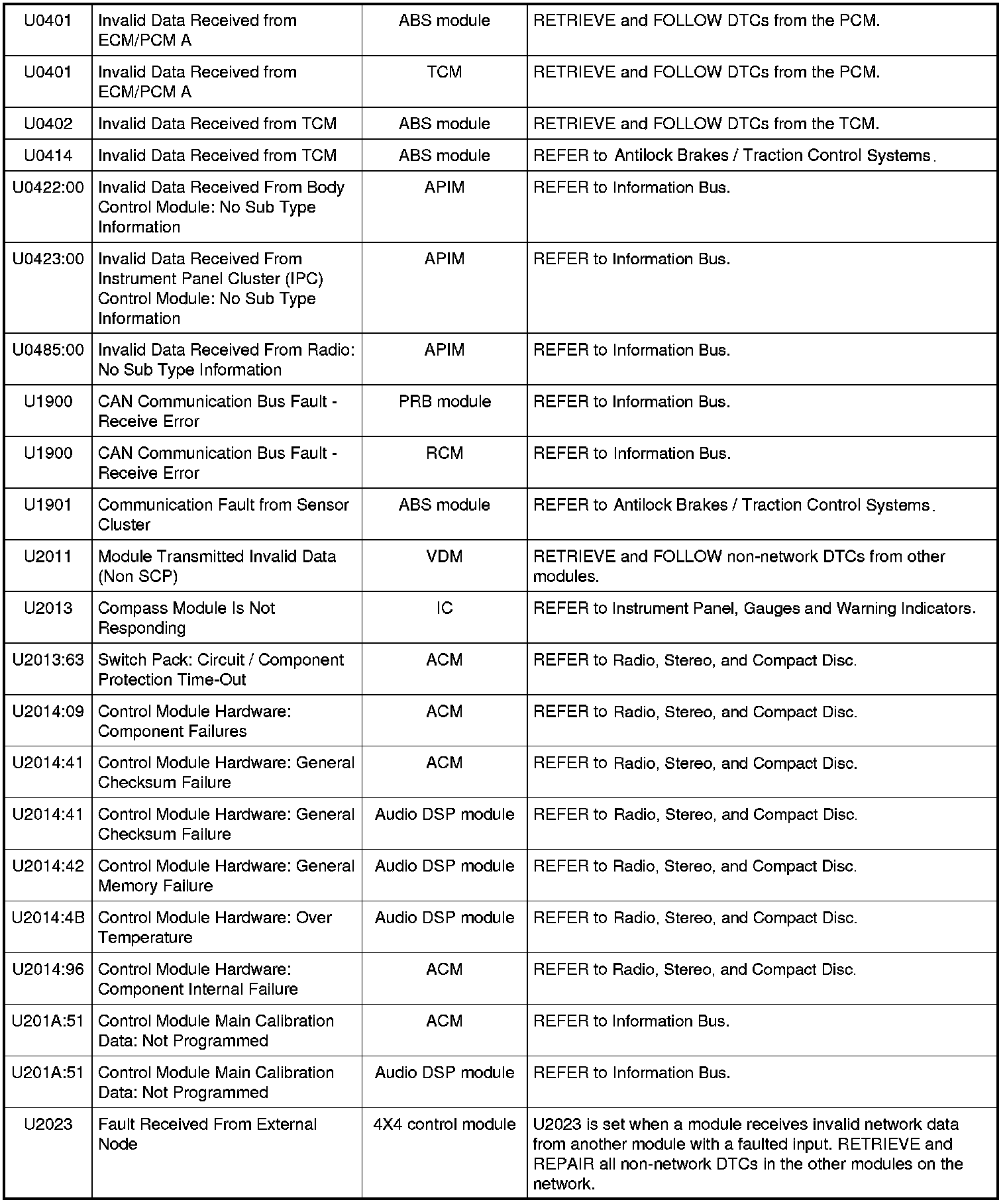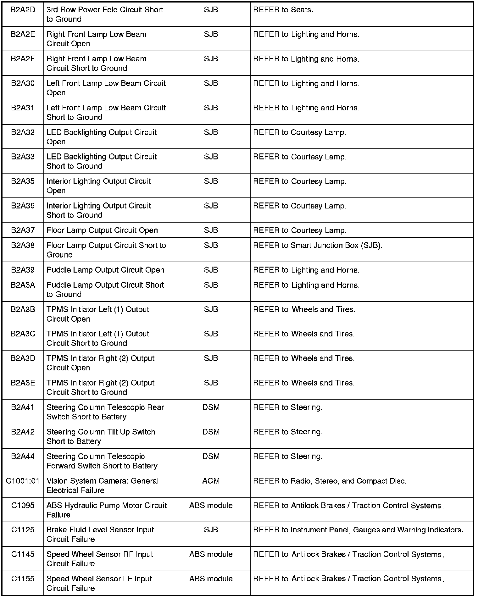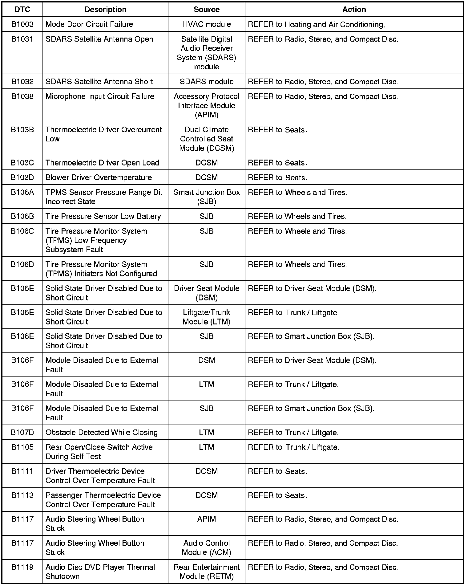 Home >> Ford >> 2009 >> Expedition 2WD V8-5.4L >> Repair and Diagnosis >> Body and Frame >> Body Control Systems >> Testing and Inspection >> Diagnostic Trouble Code Descriptions >> Diagnostic Trouble Code (DTC) Chart