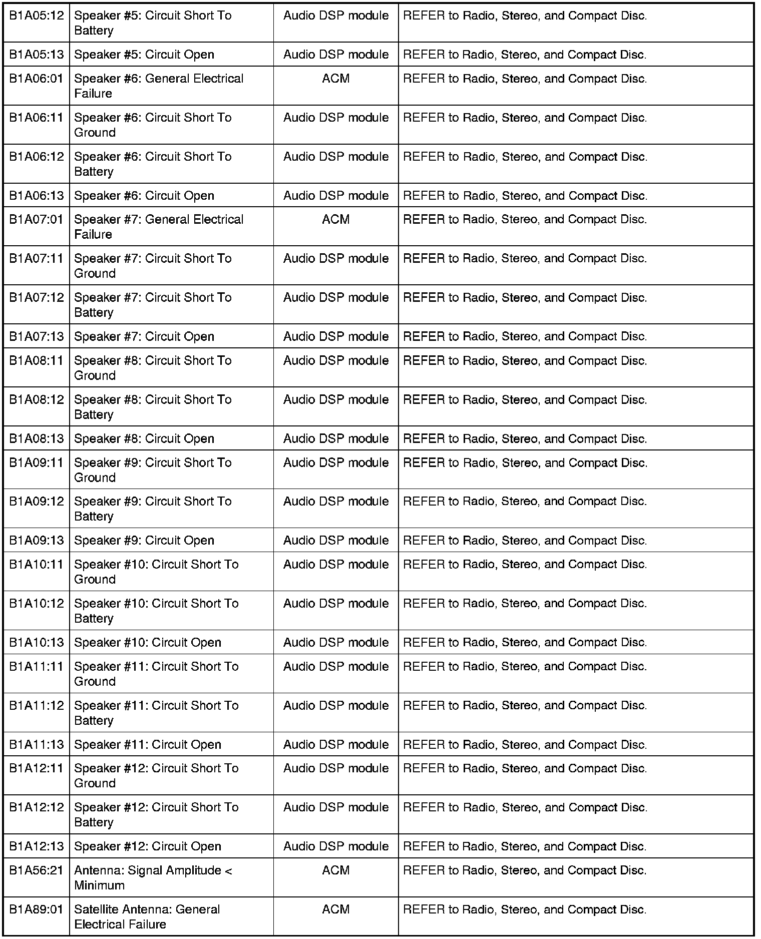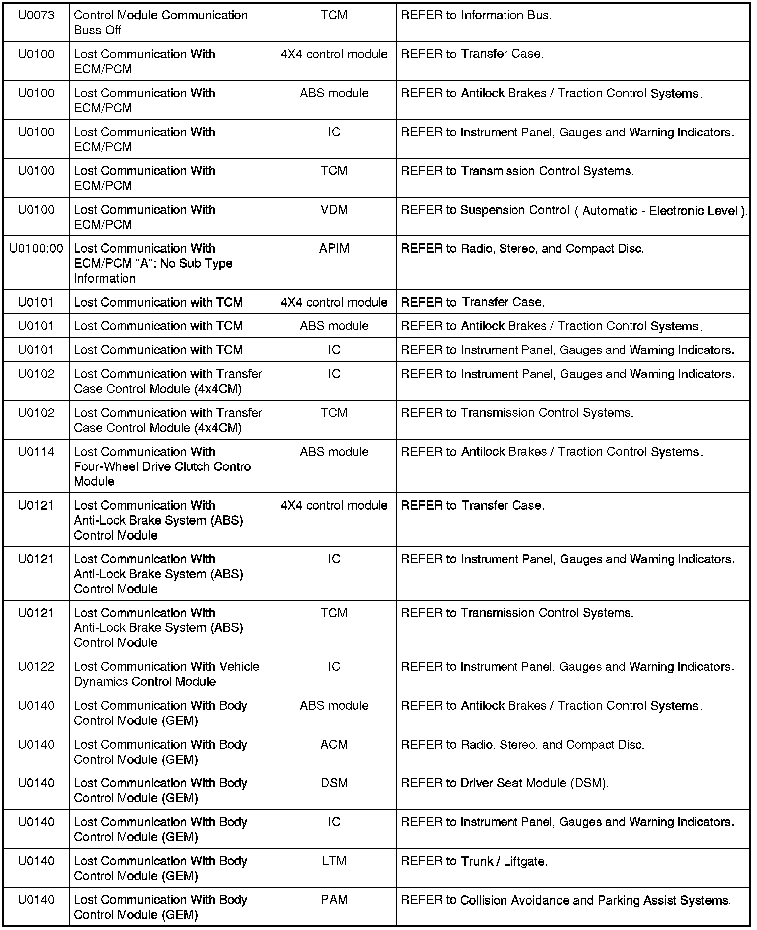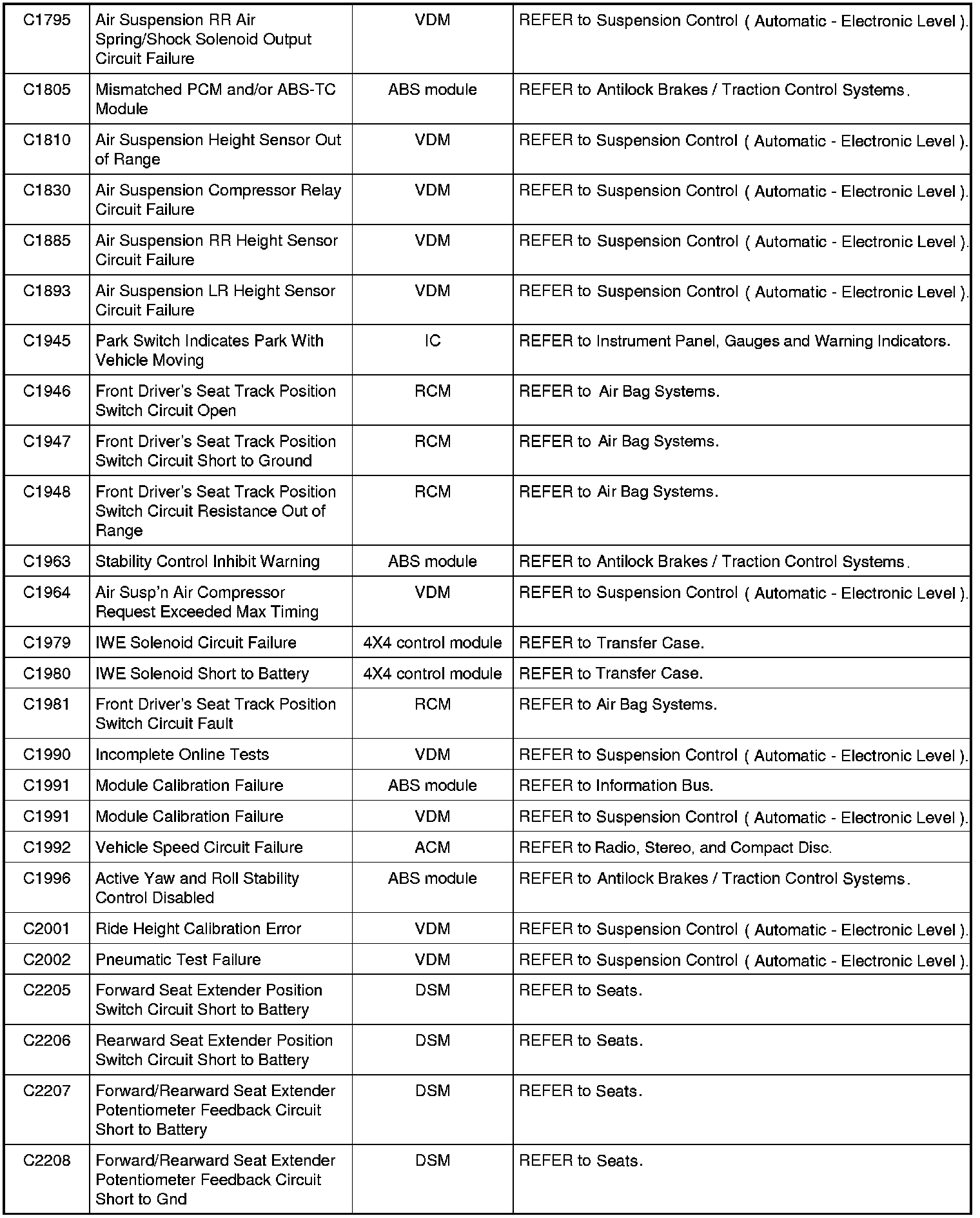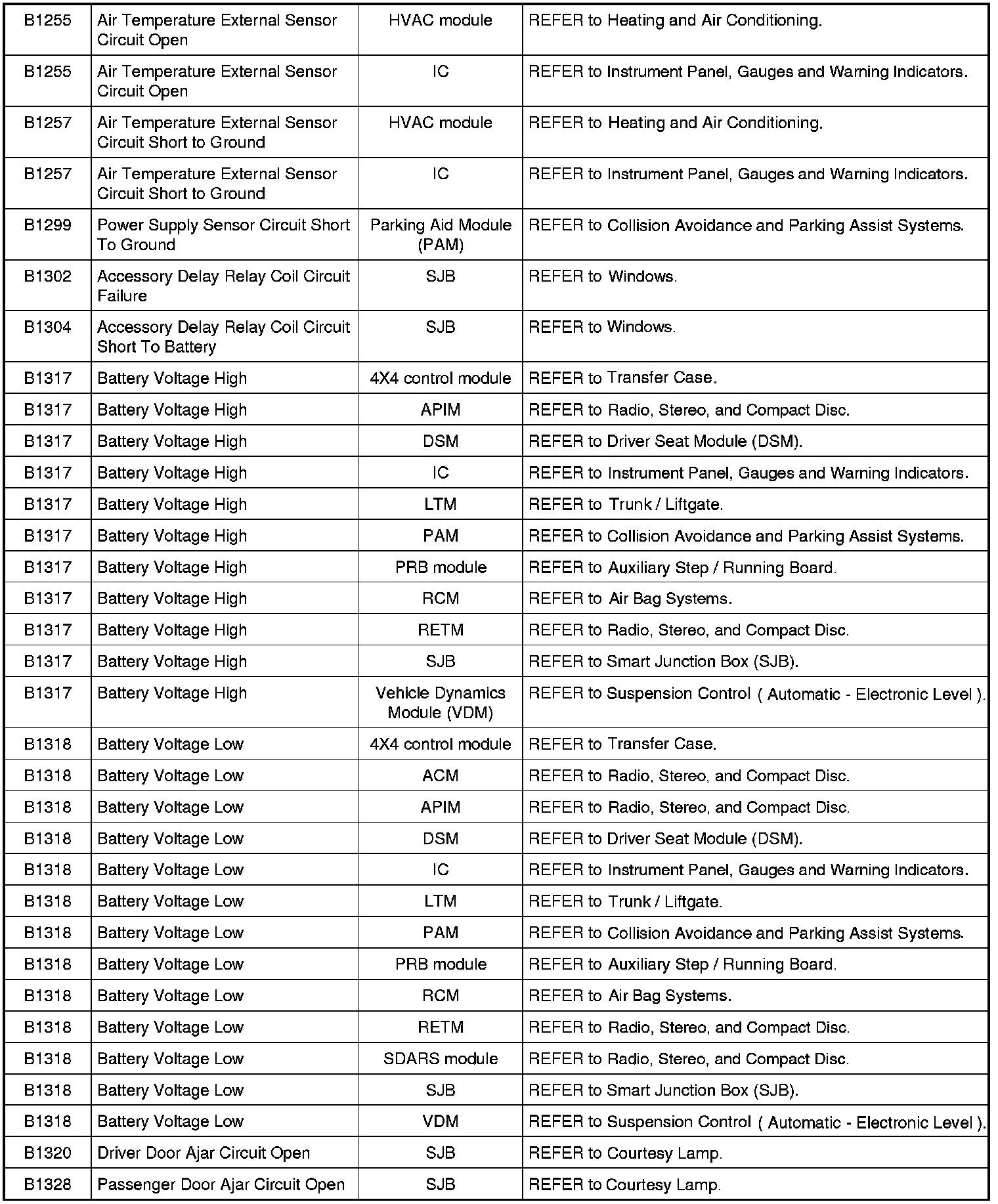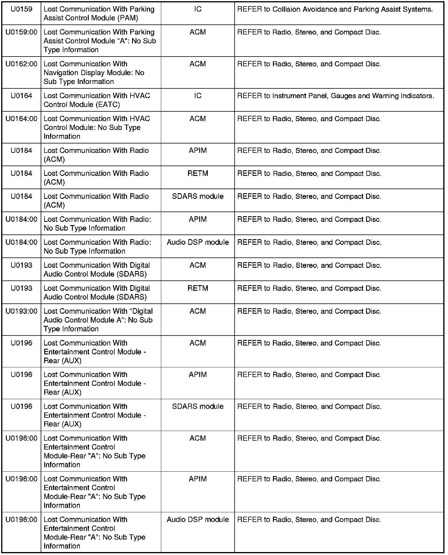 Home >> Ford >> 2009 >> Expedition 2WD V8-5.4L >> Repair and Diagnosis >> Body and Frame >> Body Control Systems >> Testing and Inspection >> Diagnostic Trouble Code Descriptions >> Diagnostic Trouble Code (DTC) Chart