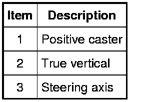 Caster is the deviation from vertical of an imaginary line drawn through the ball joints when viewed from the side. The caster specifications will give the vehicle the best directional stability characteristics when loaded and driven. The caster setting does not affect tire wear.
