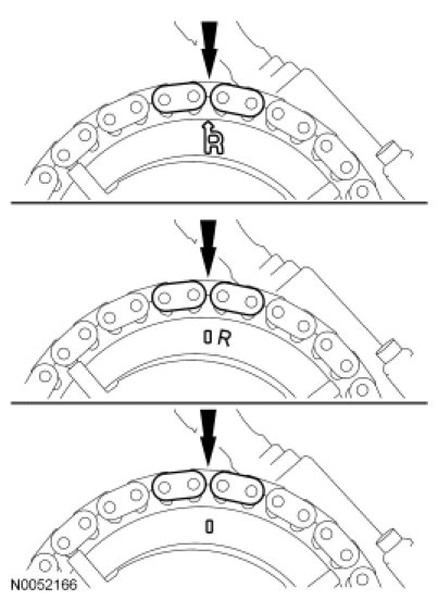 Position the RH timing chain on the camshaft phaser and sprocket. Make sure the timing mark is positioned between the 2 copper (marked) chain links.