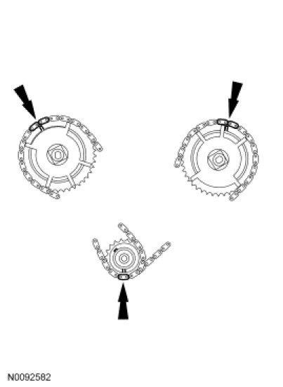 Position the timing chain on the camshaft phaser and sprocket with the timing mark positioned between the 2 copper (marked) chain links.