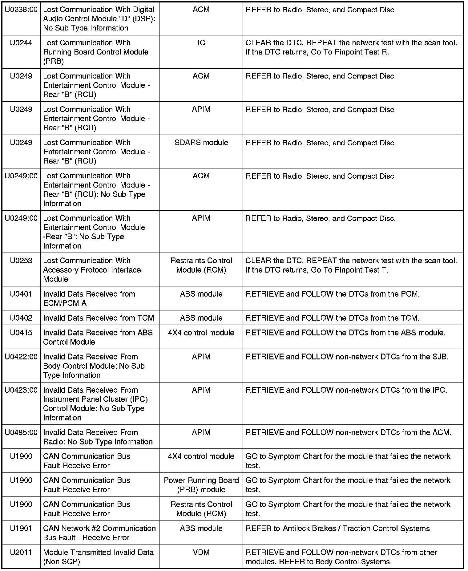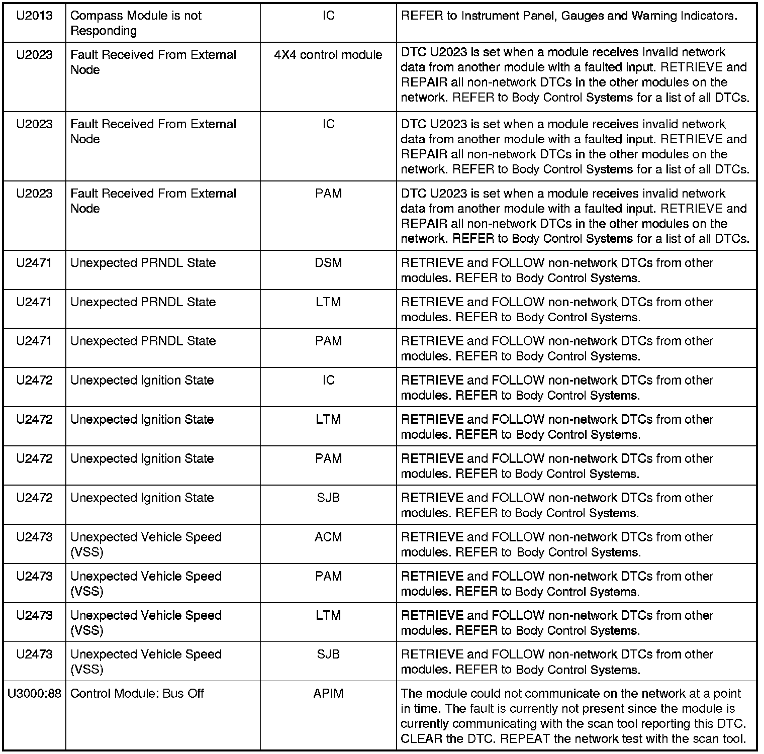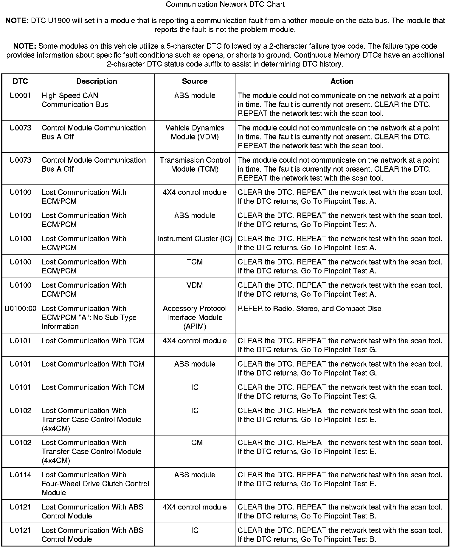 NOTE: Network DTCs (U-codes) are often a result of intermittent concerns such as faulty wiring or low battery voltage occurrences. Additionally, vehicle service procedures such as module reprogramming will often set network DTCs. Replacing a module to resolve a network DTC is unlikely to resolve the concern. To prevent repeat network DTC concerns, inspect all network wiring, especially connectors. Test the vehicle battery, refer to Battery.