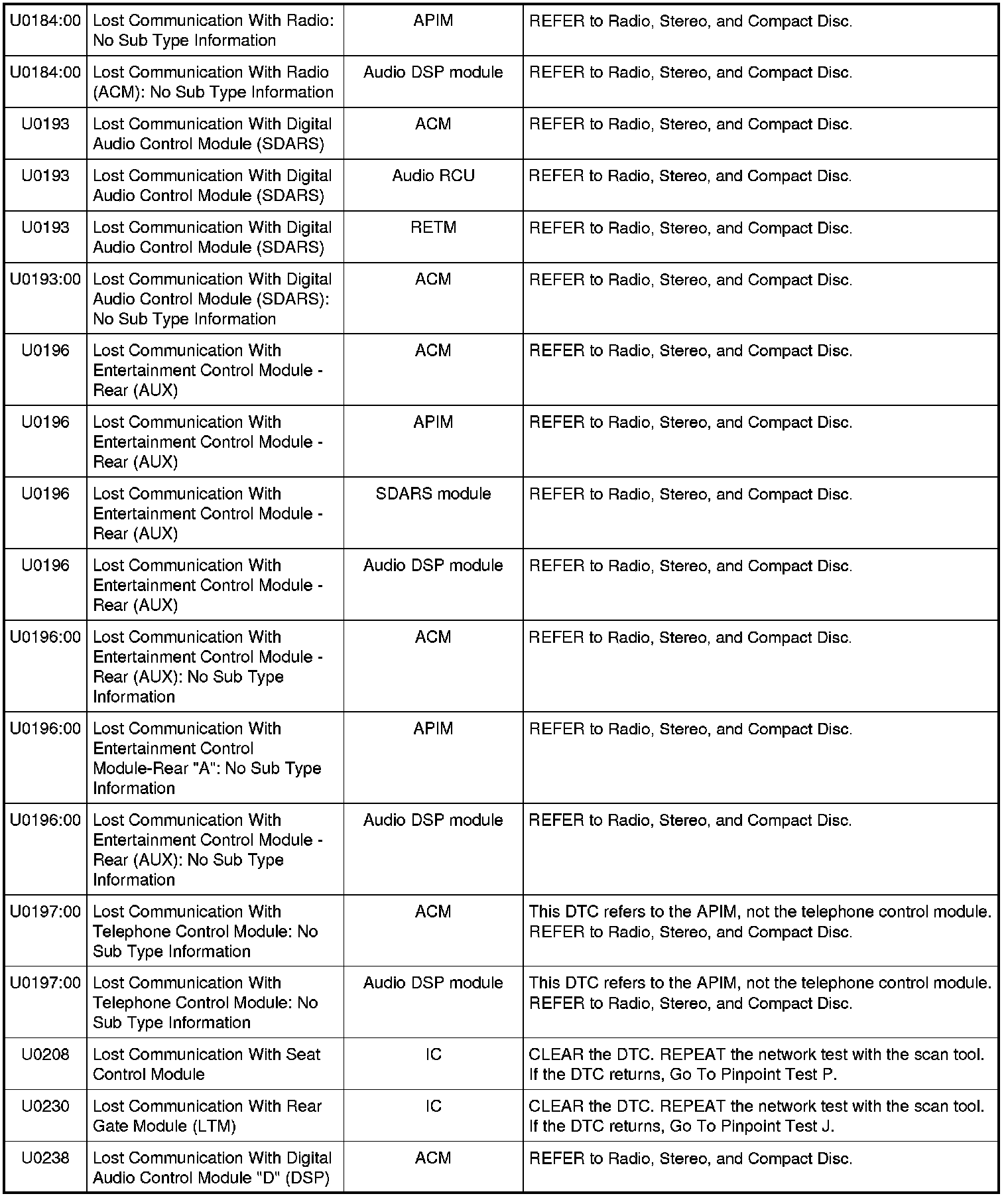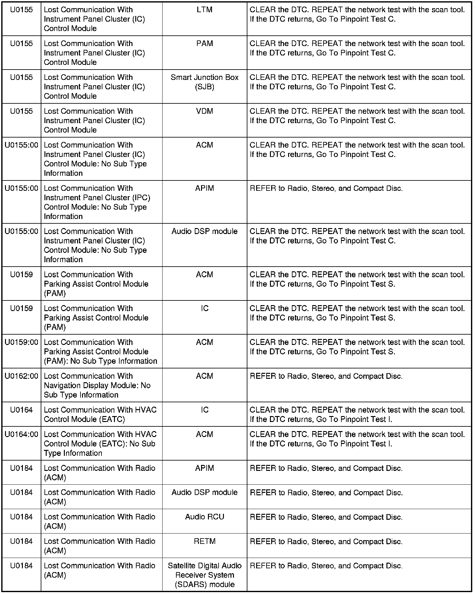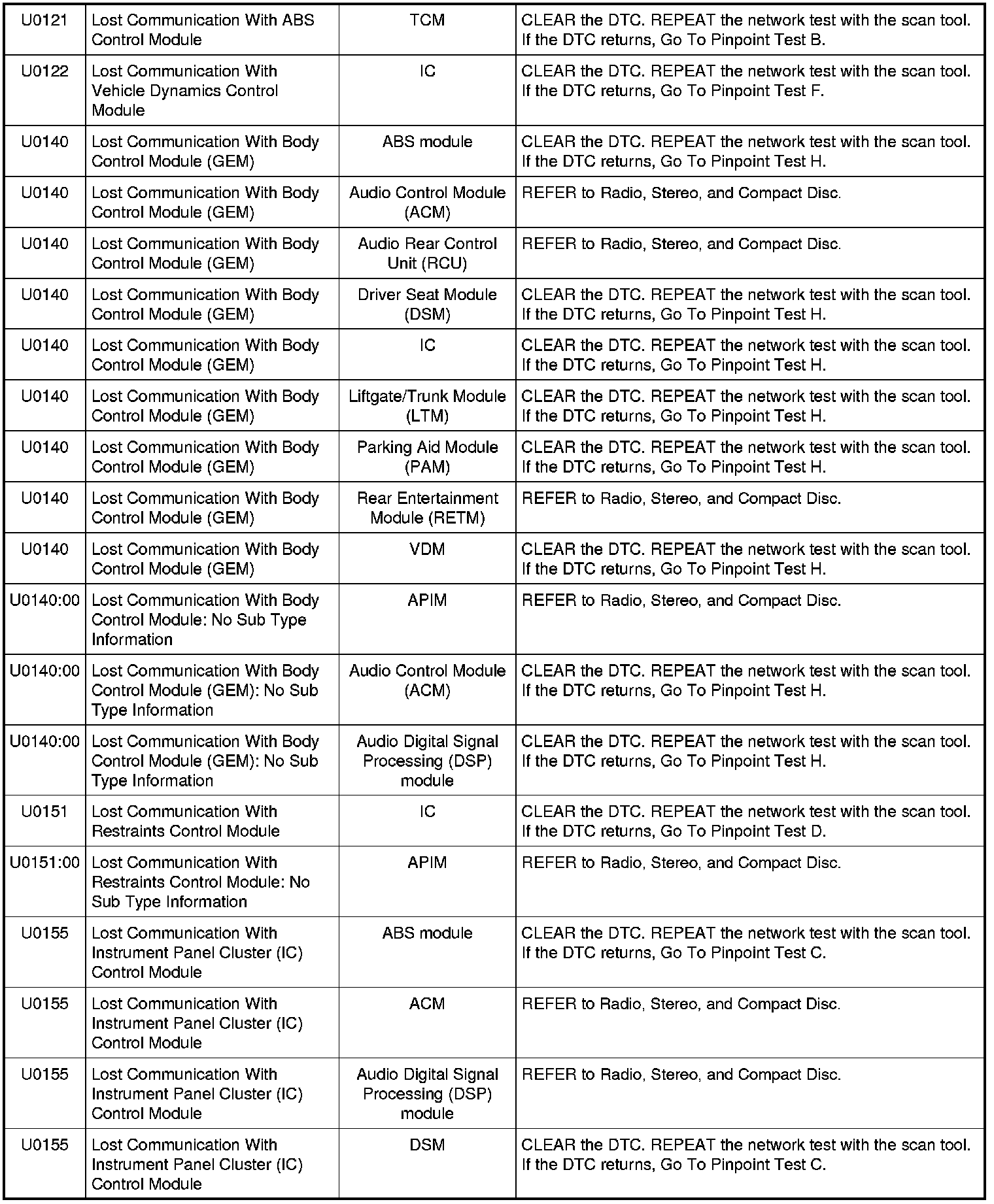 NOTE: Network DTCs (U-codes) are often a result of intermittent concerns such as faulty wiring or low battery voltage occurrences. Additionally, vehicle service procedures such as module reprogramming will often set network DTCs. Replacing a module to resolve a network DTC is unlikely to resolve the concern. To prevent repeat network DTC concerns, inspect all network wiring, especially connectors. Test the vehicle battery, refer to Battery.