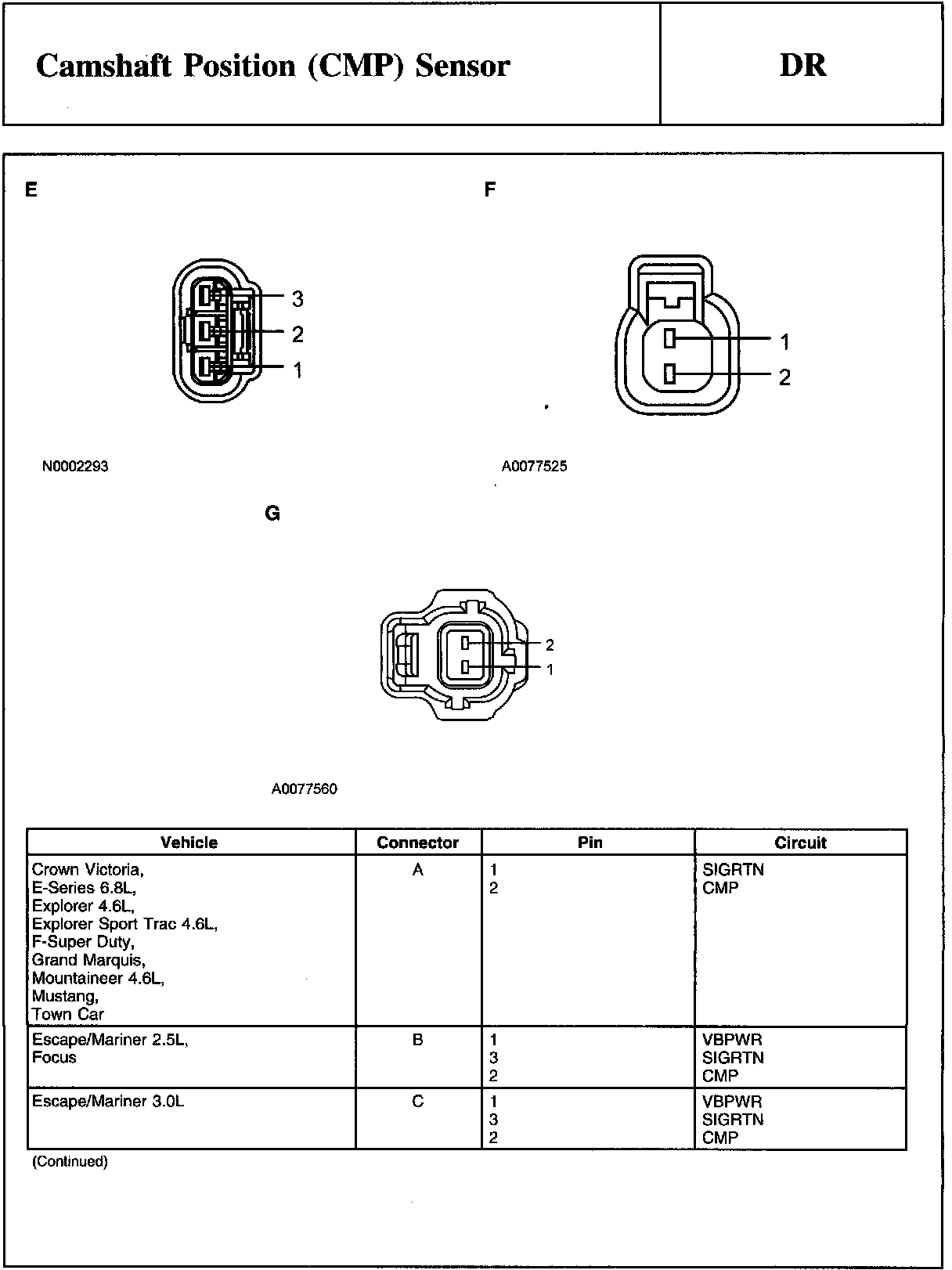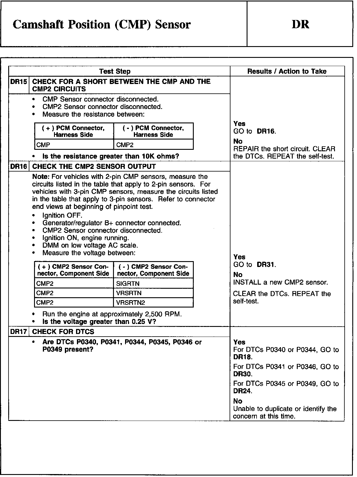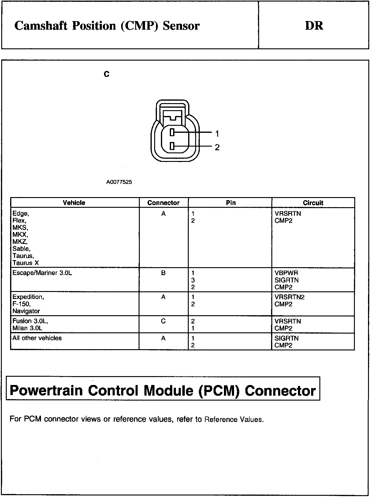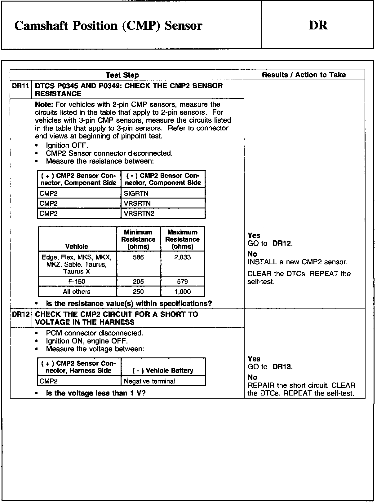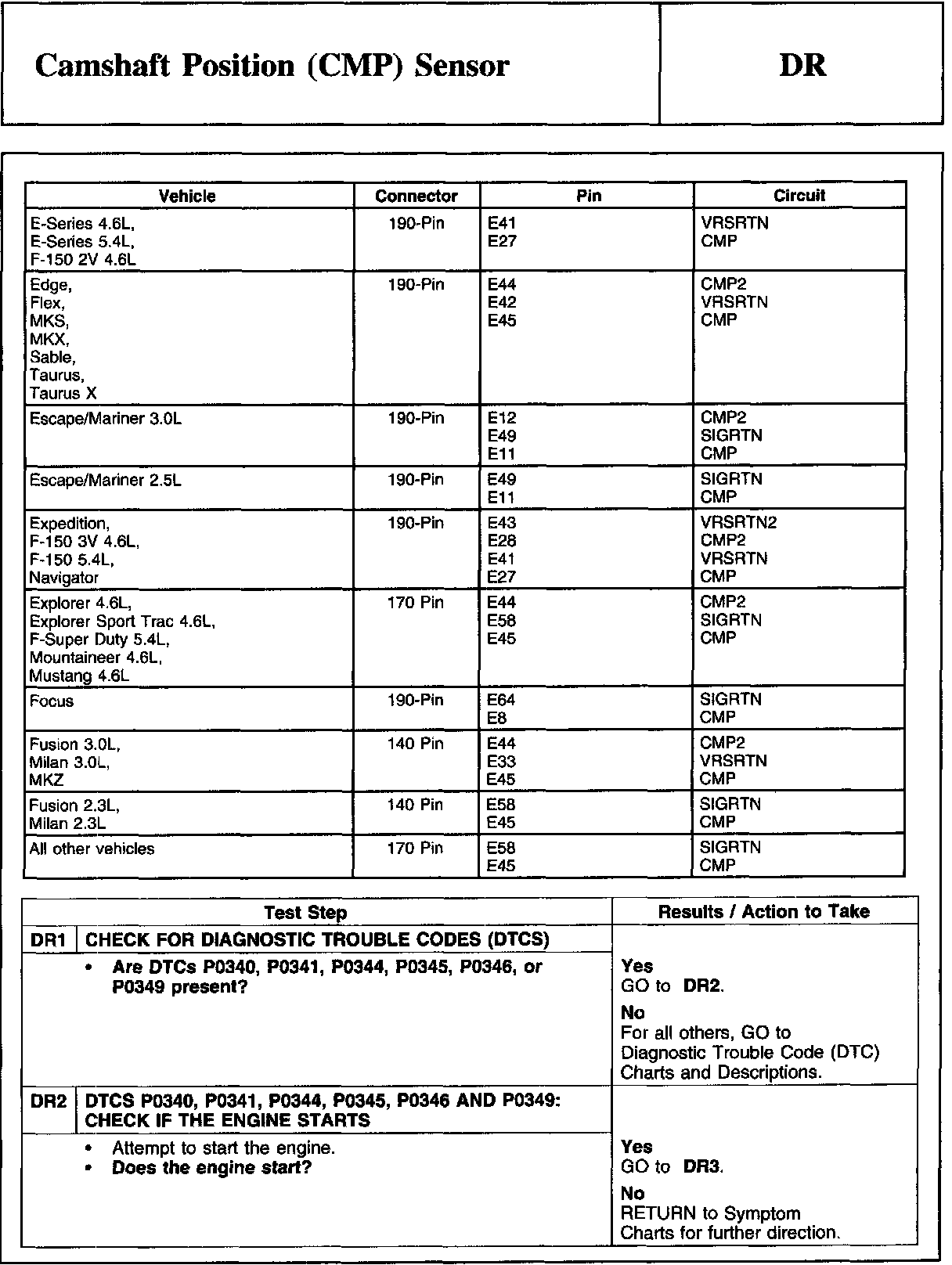 Home >> Ford >> 2009 >> Explorer 2WD V6-4.0L >> Repair and Diagnosis >> Powertrain Management >> Computers and Control Systems >> Testing and Inspection >> Pinpoint Tests >> DR - Camshaft Position (CMP) Sensor