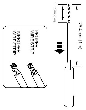 2. Strip 6.35mm (1/4 in) of insulation from each wire end, taking care not to nick or cut wire strands.