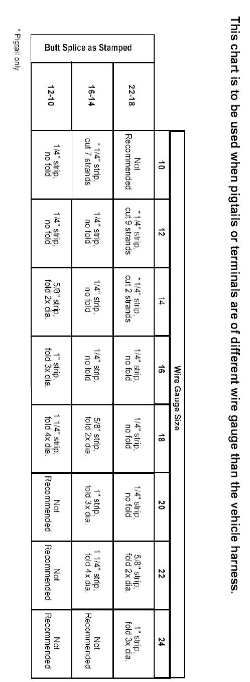 The given chart is to be used when pigtails or terminals are different wire gauge than the vehicle harness.