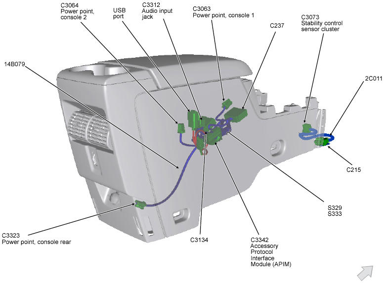 | Restraints Control Module (RCM) | Center floor console. See Figure. |