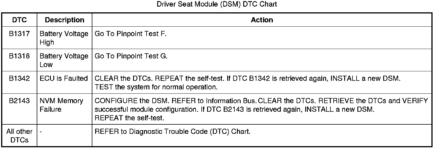 Driver Seat Module (DSM) DTC Chart
