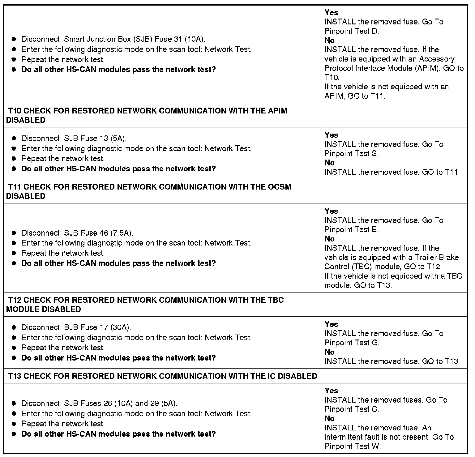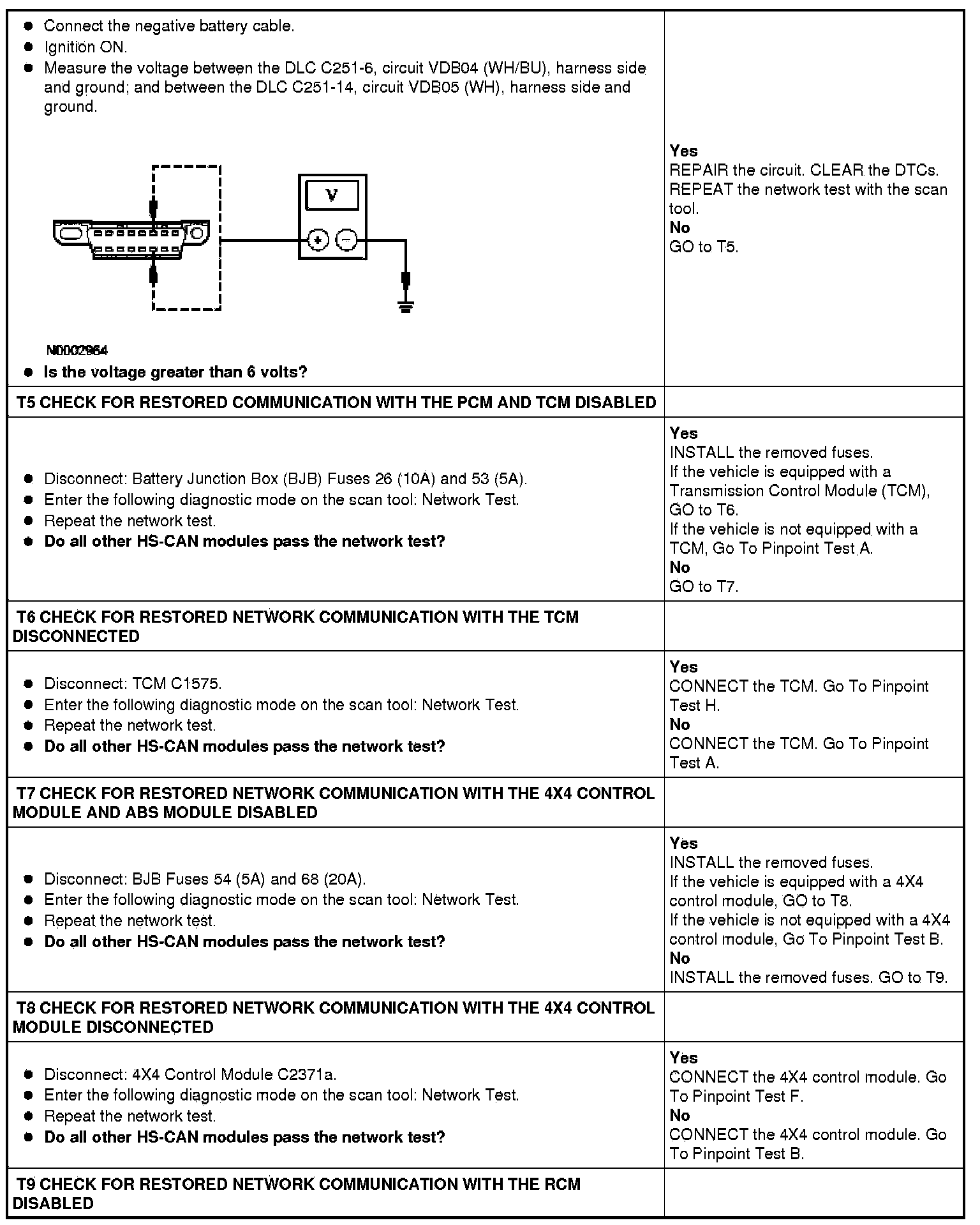 Home >> Ford >> 2009 >> F 150 2WD V8-5.4L Flex Fuel >> Repair and Diagnosis >> Powertrain Management >> Computers and Control Systems >> Information Bus >> Testing and Inspection >> Pinpoint Tests >> Pinpoint Test T: Intermittent No HS-CAN Communication, One Or More Module Are Not Responding During Network Test